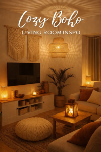 Cozy Boho Living Room Decor Ideas with Warm Ambient Lighting and Macrame Wall Art