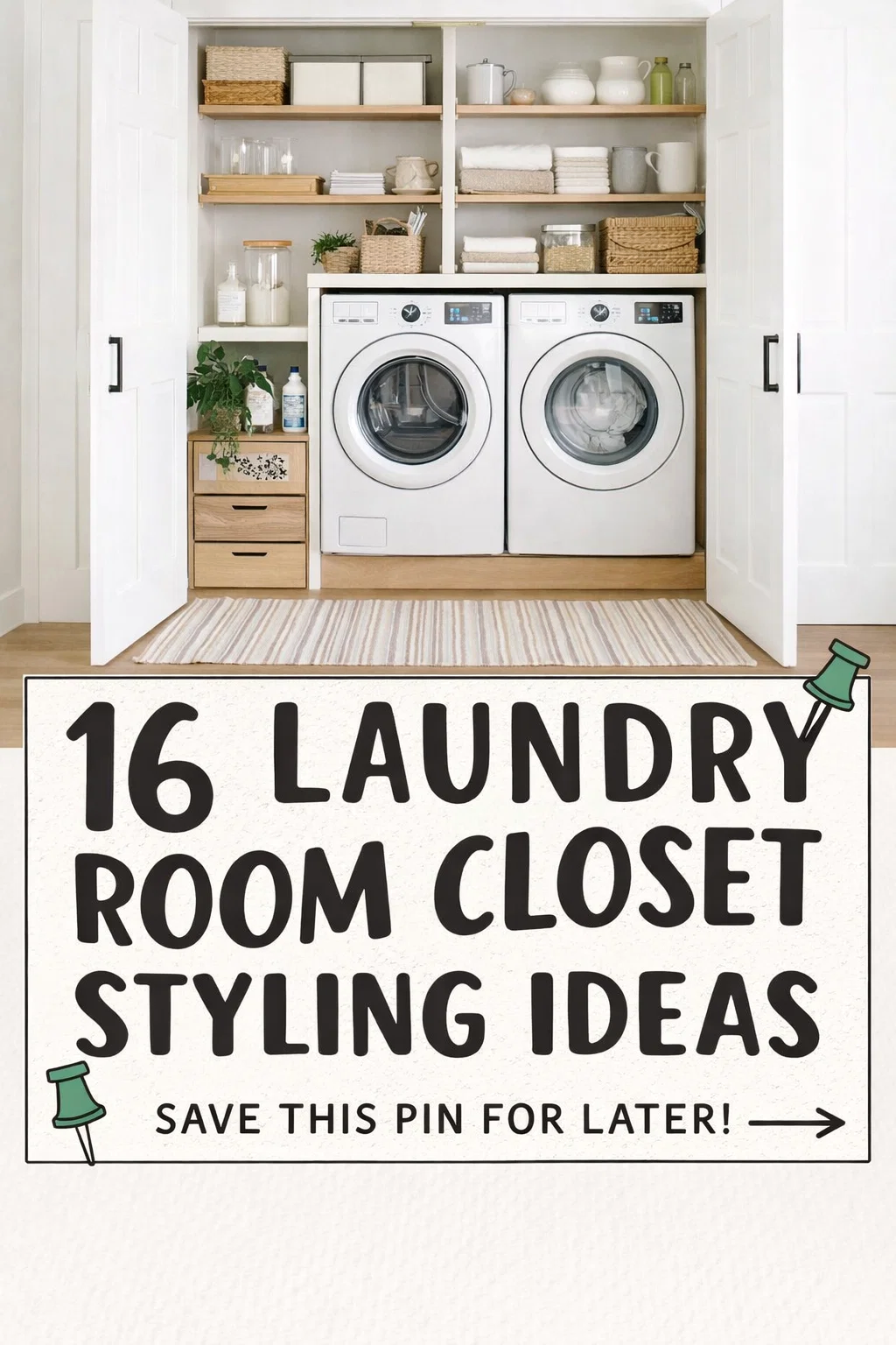For those with extremely narrow closets, stacking your washer and dryer is the ultimate space-saving move. This often leaves room on the side for a narrow pull-out utility cart or a set of slim shelves. The bottom-right photo in the inspiration collage shows how a stacked unit allows for a dedicated vertical shelving unit right next to the machines, perfect for towels and folded linens.
