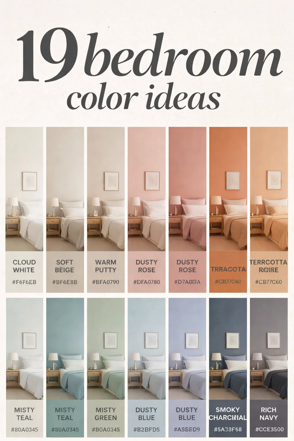 If you go for a bold Rich Navy, you can create a stunning contrast with crisp white linens and light-colored wood nightstands. The goal is to create a cohesive story where the wall color and the furniture work together rather than competing for attention. Use the hex codes provided in the image (#F6F6EB, #80A0345, etc.) to help you find matching accessories or digital decor inspiration online.