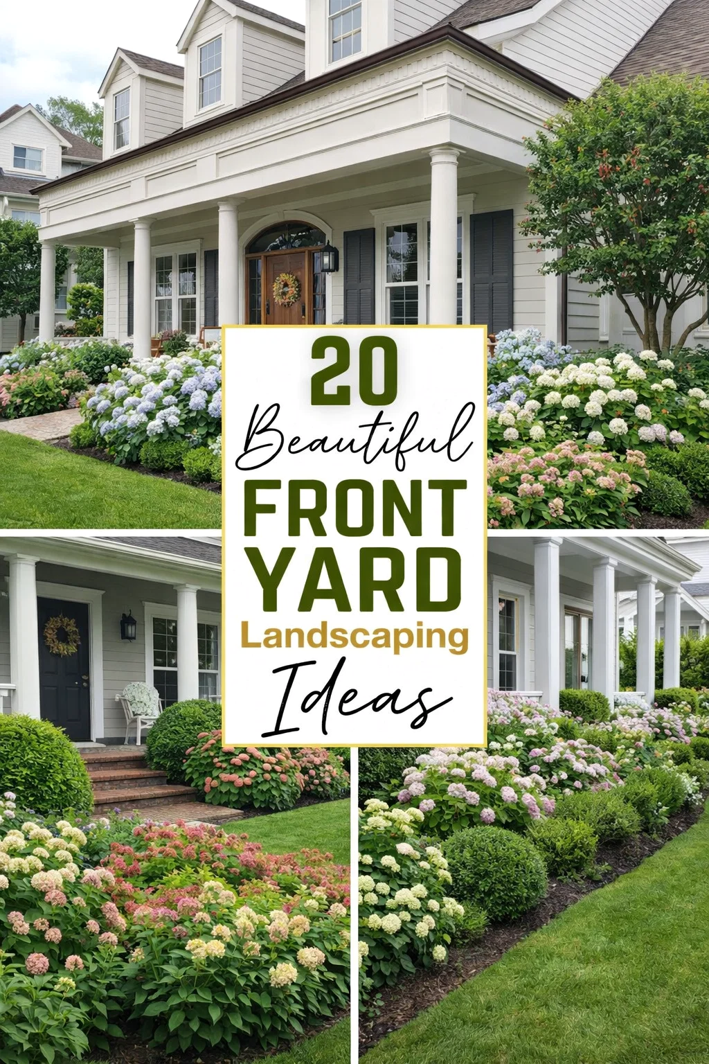 Transforming the exterior of your home is one of the most rewarding home improvement projects you can undertake. When you look at a beautifully landscaped front yard, it does more than just increase the value of the property. It creates a sense of pride and a warm welcome every time you pull into your driveway. The image we are analyzing today showcases three distinct styles of front yard perfection, emphasizing lush greenery, vibrant floral displays, and structural elegance. From the classic appeal of white columns to the soft textures of hydrangeas, these designs prove that your yard is a canvas waiting for a masterpiece.