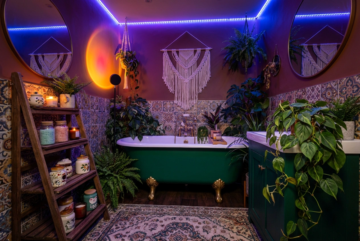 Your vibrant bathroom vision can adapt to any constraint. For a bohemian-inspired bathroom, layer in macramé plant hangers, a vintage Persian-style rug (made for bathrooms), and plenty of greenery like pothos or snake plants that thrive in humidity. A glamorous, art-deco vibe calls for geometric patterns, mirrored surfaces, and luxe materials like marble and velvet.