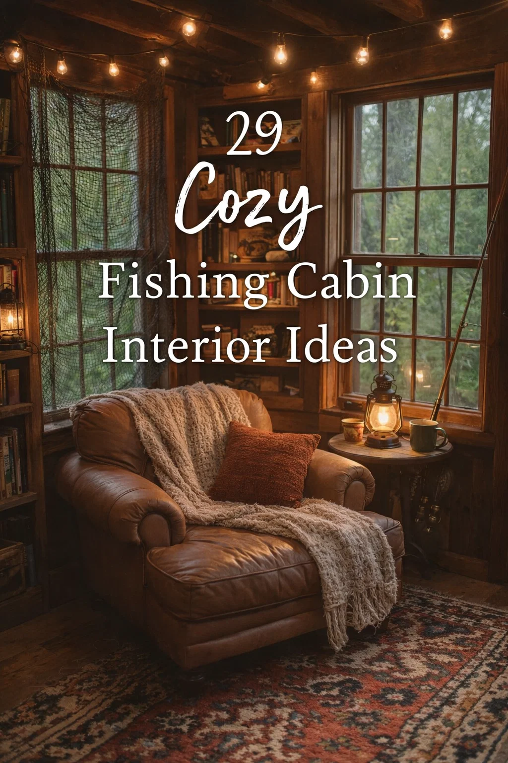 A fishing cabin should pay homage to its surroundings without feeling like a theme park. Subtle nods to the lake environment create a cohesive look that feels authentic. One of the most creative ideas shown in the image is the use of a dark fishing net as a decorative window accent. It provides a bit of texture and visual interest without blocking the view of the lush greenery outside. It is a brilliant way to bring the purpose of the cabin indoors.