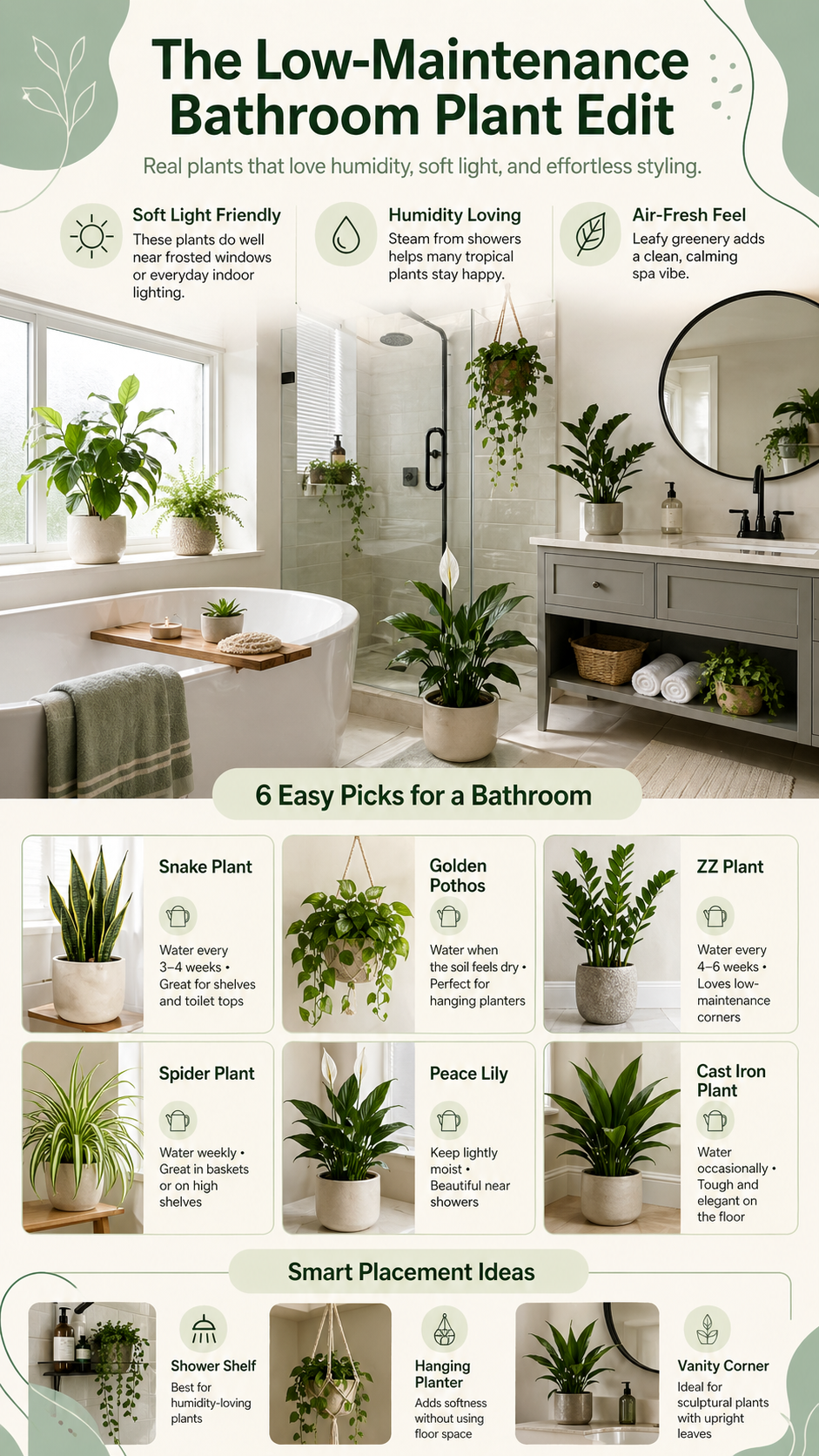 Bathroom plant decor is one of the easiest ways to make a practical space feel calm, stylish, and personal. With humidity-loving, low-maintenance plants like snake plants, golden pothos, peace lilies, ZZ plants, cast iron plants, spider plants, and Chinese evergreens, you can create a fresh indoor garden feeling without a complicated routine.