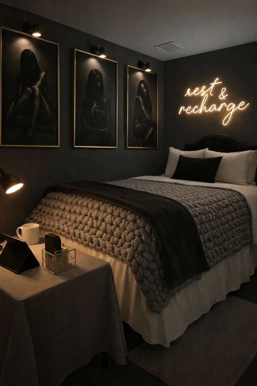One of the most striking features of the inspiration image is the oversized, chunky knit blanket draped over the bed. Texture is what prevents a black room from feeling cold or uninviting. When you strip away a variety of colors, you must replace that visual interest with physical texture. The heavy braids of the wool blanket provide a tactile softness that balances the sharp lines of the furniture and the frames. It invites you to sit down and relax, which is exactly what a bedroom should do.