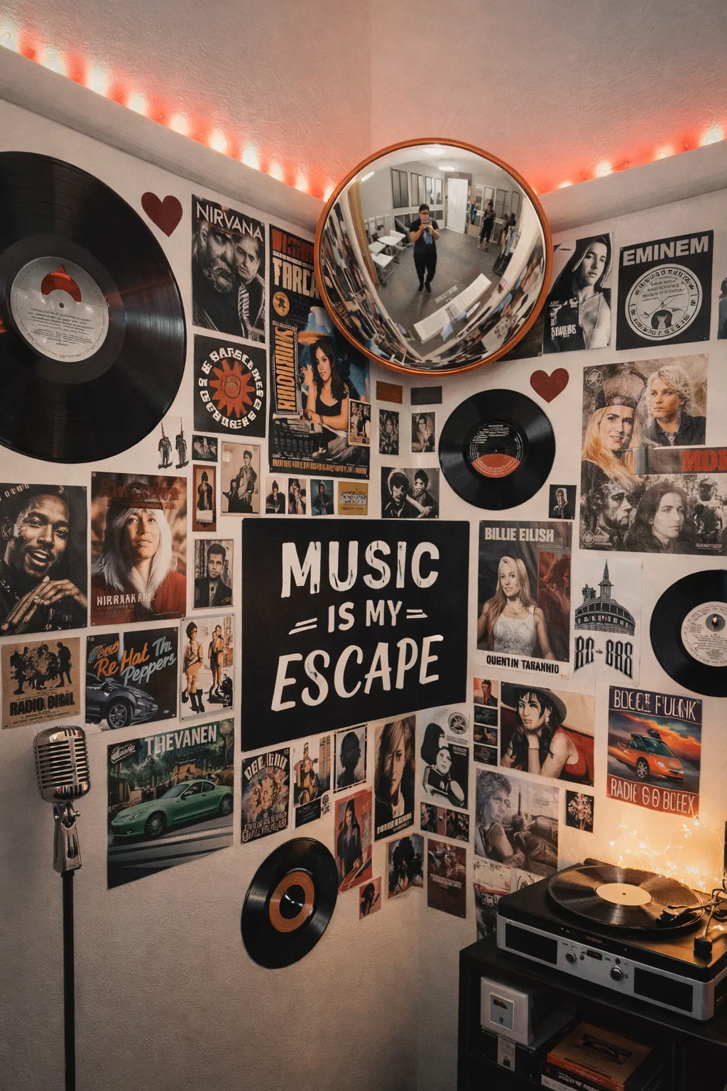 While the wall looks incredibly diverse, a closer look reveals a loose color palette that acts as an anchor. Red, black, and white are the dominant colors. You see the red from the Red Hot Chili Peppers logo, the red lips from the Vogue print, the red Porsche text, the red in the Billie Eilish poster, the red edge of the convex mirror, and the red glow from the LED string lights. The rest is largely composed of black-and-white images or sepia tones. This limited, recurring palette provides a visual rhythm and consistency that prevents the collage from becoming a muddled, chaotic mess. The common colors act as the “thread” that stitches the whole tapestry together.