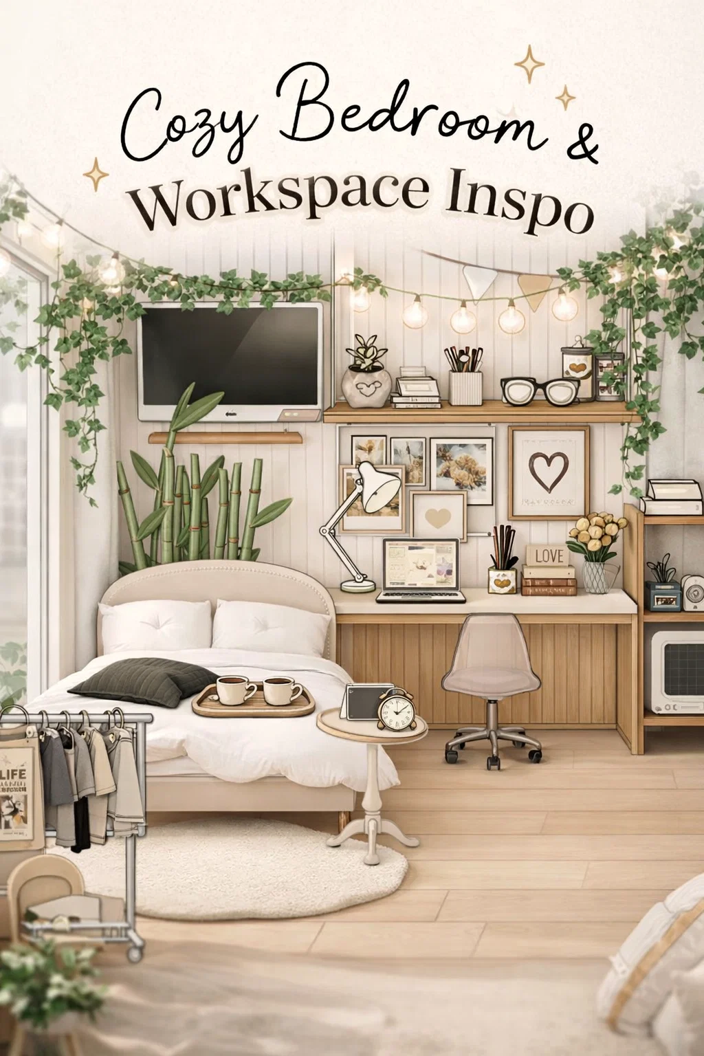 The bamboo is a clever choice for a headboard alternative. Instead of a traditional bulky headboard, placing a row of bamboo creates a Zen-like atmosphere. It gives the bed area a clear definition without taking up too much visual weight. If you are designing a small room, using tall, thin plants like bamboo is a great way to add height without cluttering the floor space. It makes the room feel airy and fresh, which is exactly what the aesthetic style aims for.