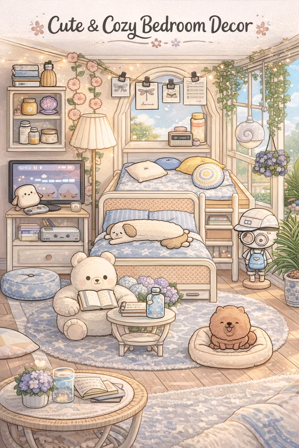 The first thing that hits you about this room is the atmosphere. It’s not just a collection of random furniture; it’s a lived-in space with a clear story. It manages to be cluttered in the most charming way possible, which is the hallmark of the ‘aesthetic’ style that is so popular right now. The color palette is the foundation: soft, muted blues are dominant, creating a calm and inviting base. These are accented by warm yellows and peach tones, with pops of natural green. It’s a color wheel that just works.