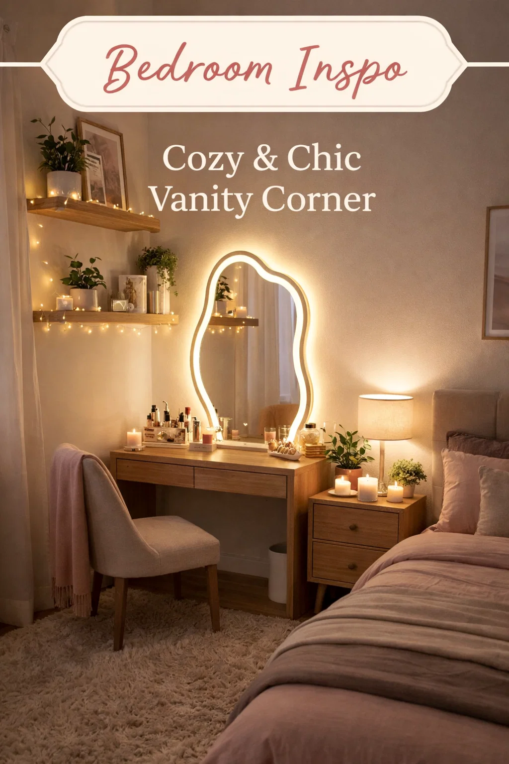 Transforming your bedroom into a glowy retreat is surprisingly achievable. By focusing on a “hero” piece like a wavy backlit mirror and surrounding it with natural textures, soft lighting layers, and a touch of greenery, you create a space that feels both modern and incredibly cozy. It’s all about the details—the flicker of a candle, the trail of a vine, and that perfect amber glow that greets you at the end of a long day.