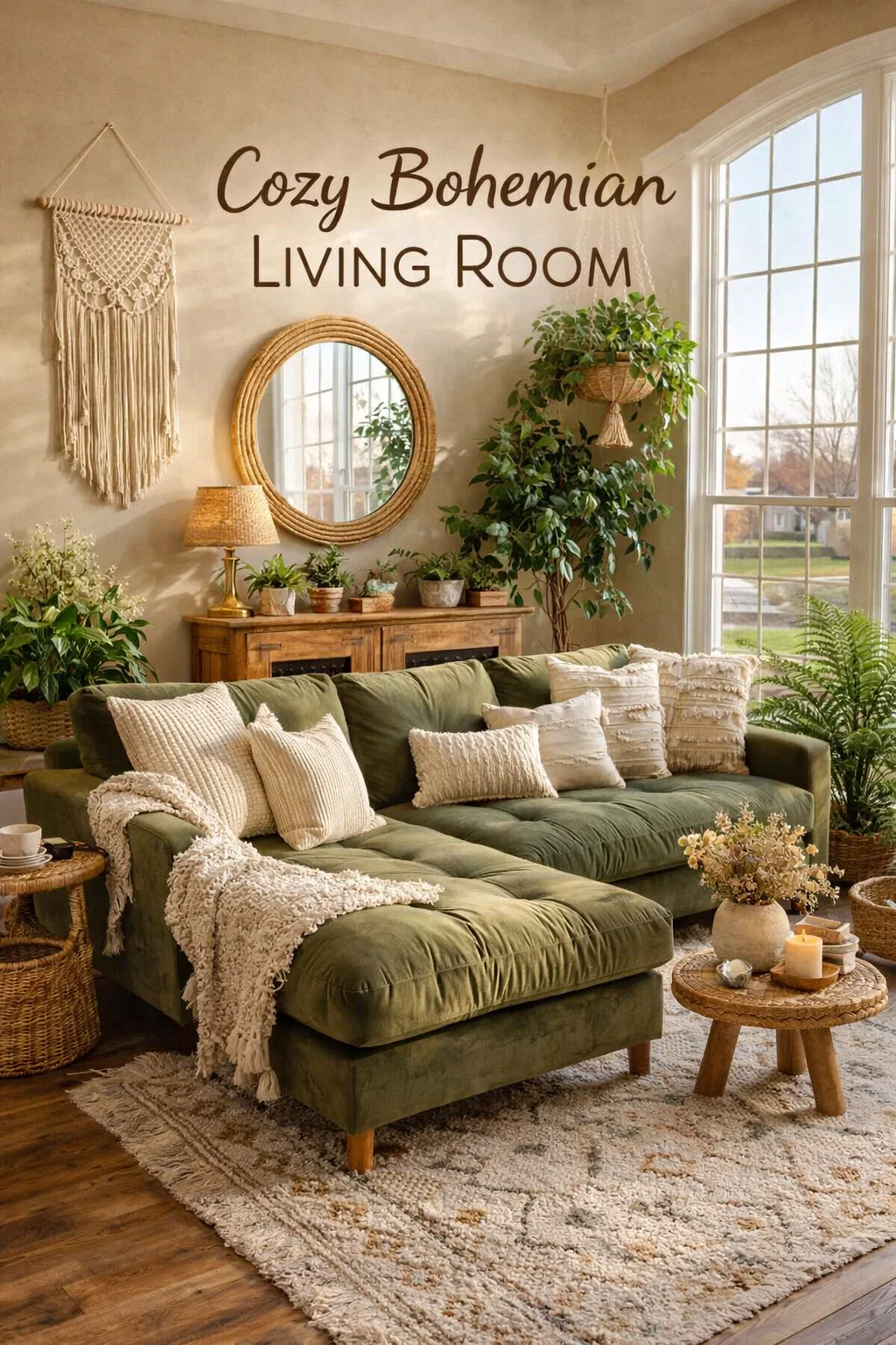 Cozy Boho Living Room Decor Ideas with Olive Green Sectional Sofa and Macrame Wall Art