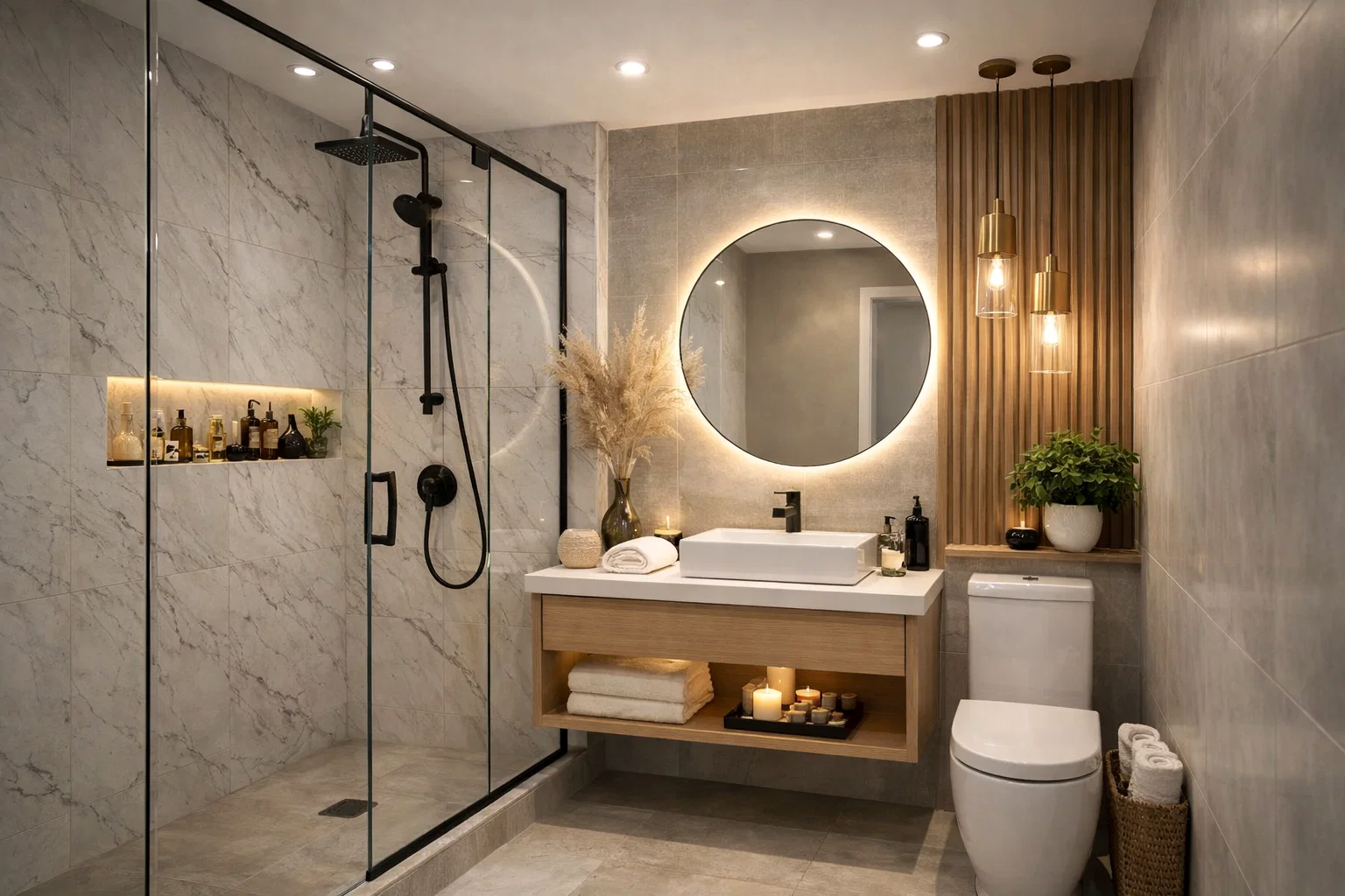 - Lighting Layers: Effective lighting is non-negotiable. Combine ambient (overhead), task (vanity mirror lights), and accent (LED strips, sconces) lighting. For a luxury feel, install a statement chandelier or elegant wall sconces. In modern designs, backlit mirrors and recessed ceiling lights provide clean, functional illumination.