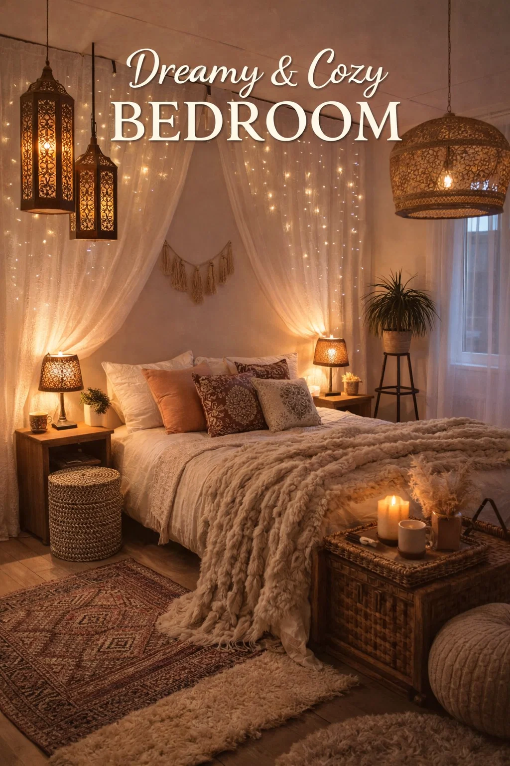 Cozy Boho Bedroom Decor Ideas with Warm Fairy Lights and Moroccan Lanterns