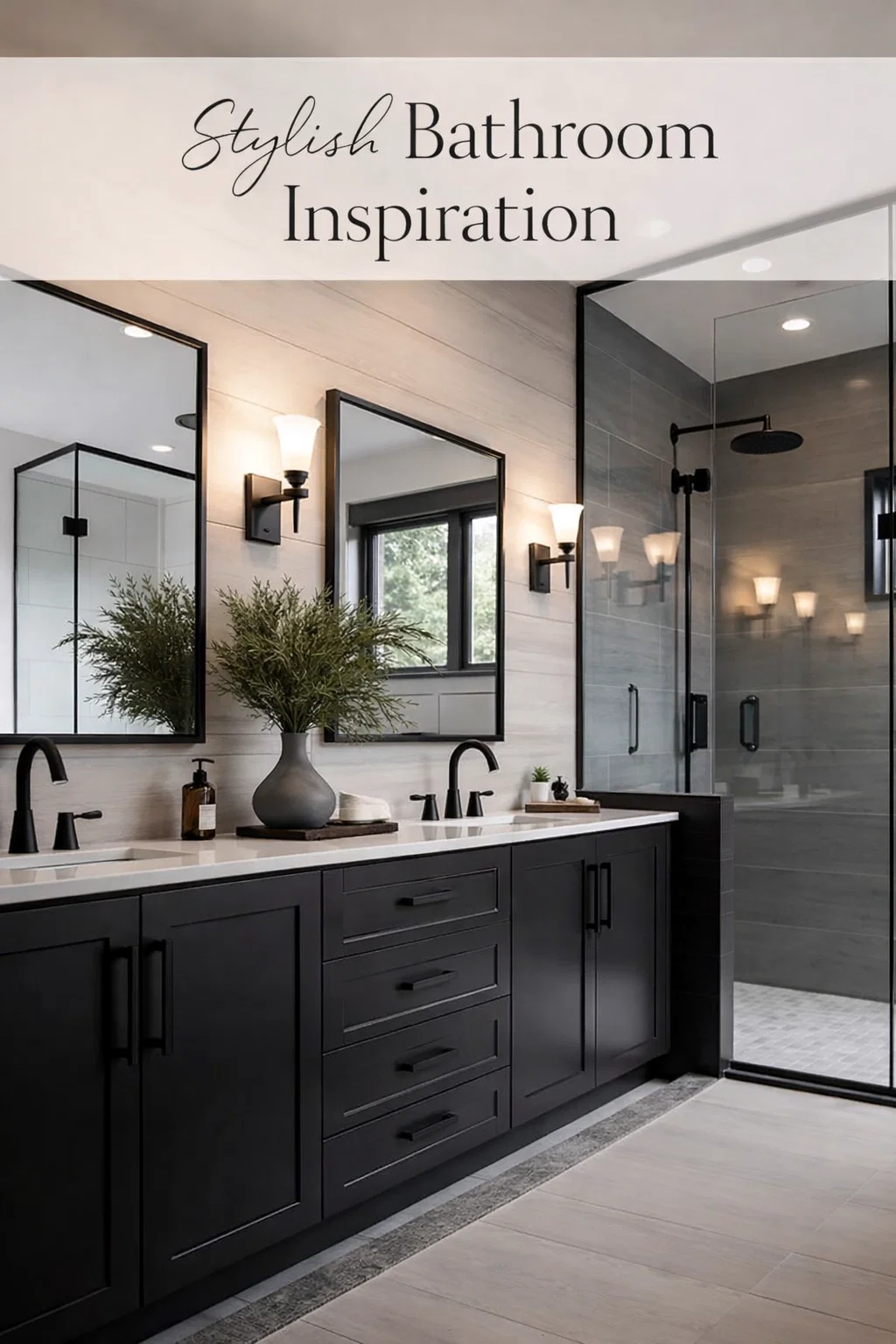 Modern Black Double Vanity Bathroom with Glass Walk-in Shower and Shiplap Wall