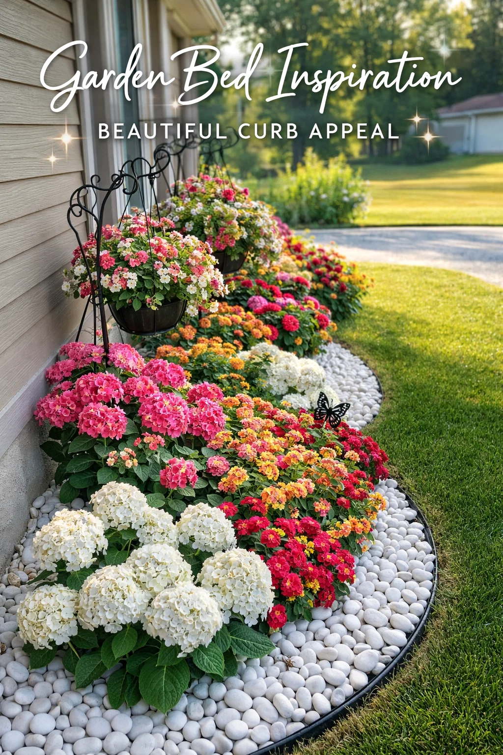 Beautiful Front Yard Curb Appeal Idea with White River Rocks and Pink Hydrangeas
