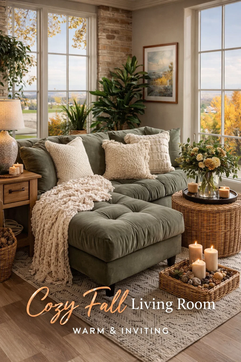Cozy Sage Green Velvet Sectional Living Room Decor Ideas with Organic Textures