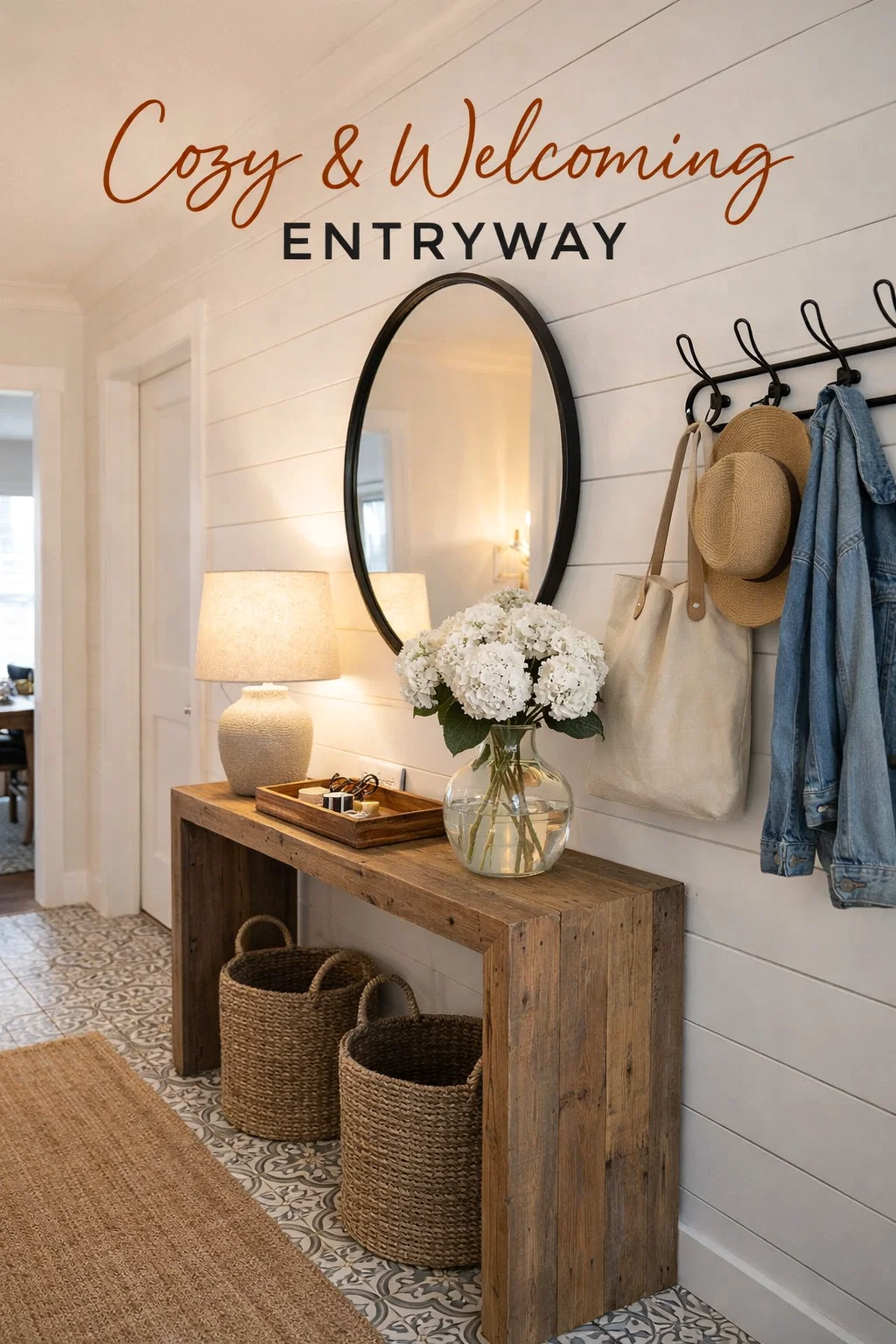 Modern Farmhouse Entryway Decor with Reclaimed Wood Console Table and Shiplap Walls
