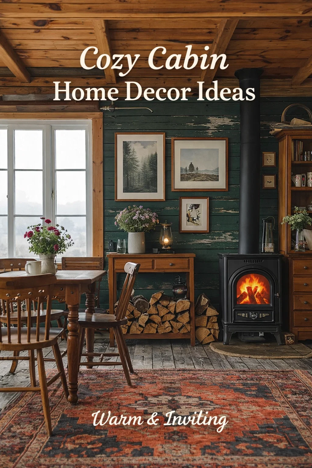 Cozy Rustic Cabin Interior Ideas Dark Green Shiplap Walls Wood Burning Stove Decor