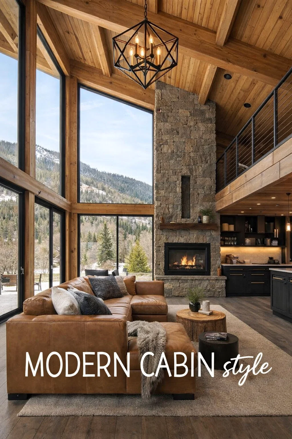 Modern Luxury Cabin Interior with Floor-to-Ceiling Windows and Stone Fireplace