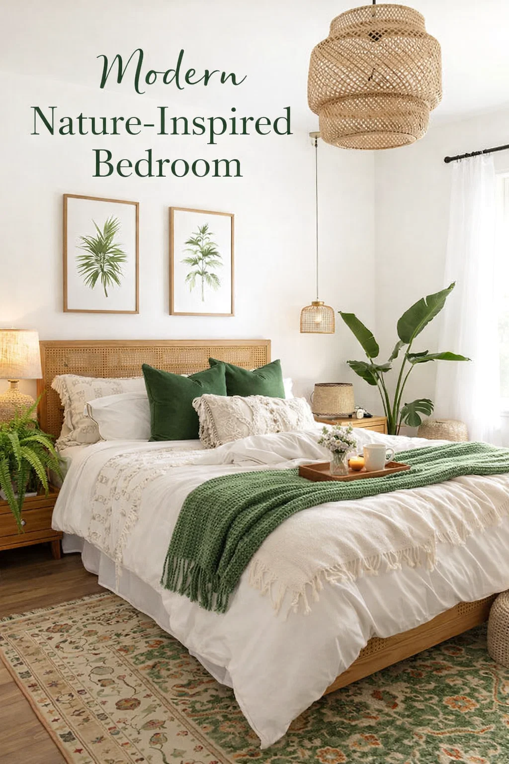 Boho Tropical Bedroom Ideas with Green Accents and Natural Rattan Textures