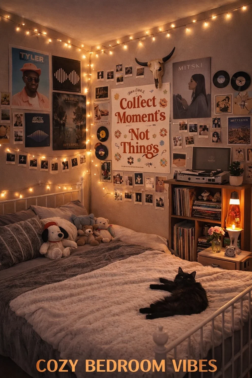 Cozy Indie Rock Bedroom Decor Ideas with Fairy Lights and Aesthetic Band Posters