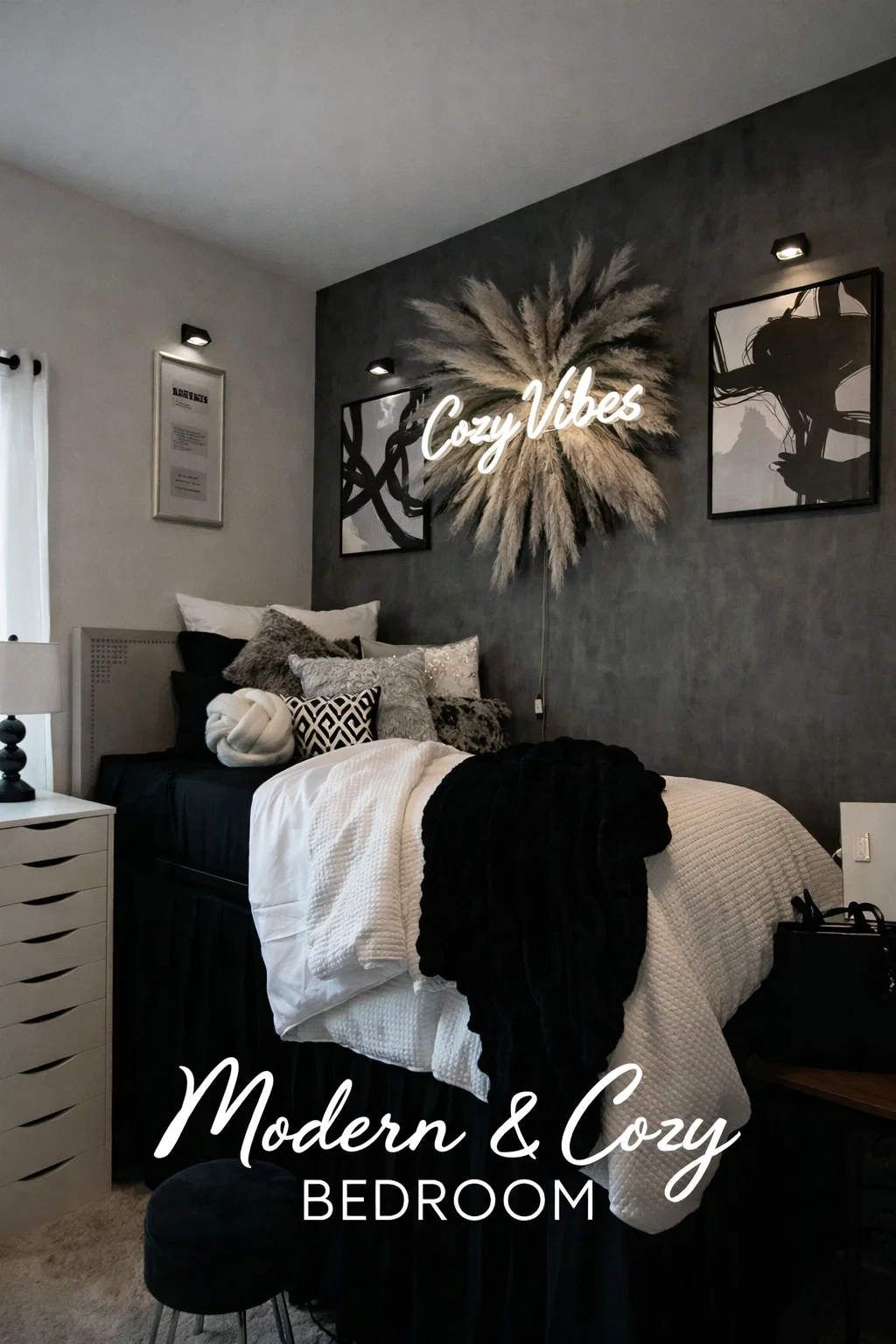 Aesthetic Black and White Dorm Room Decor Ideas Dark Accent Wall Neon Sign Bedroom