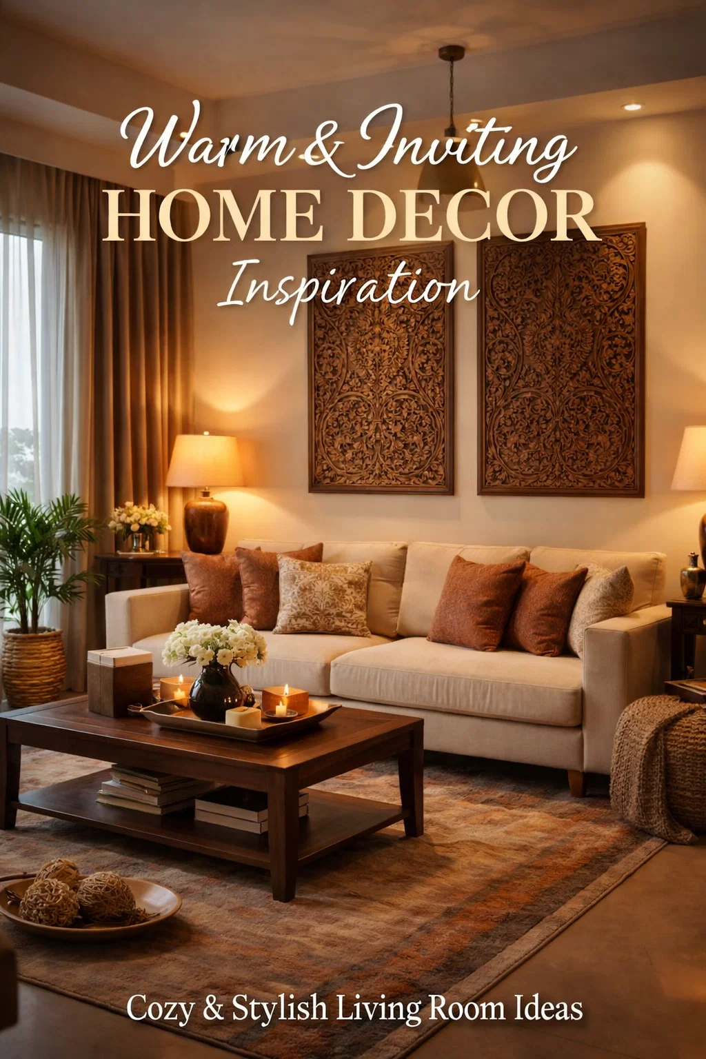 Warm Earthy Living Room Decor Ideas with Carved Wood Wall Art and Cozy Lighting