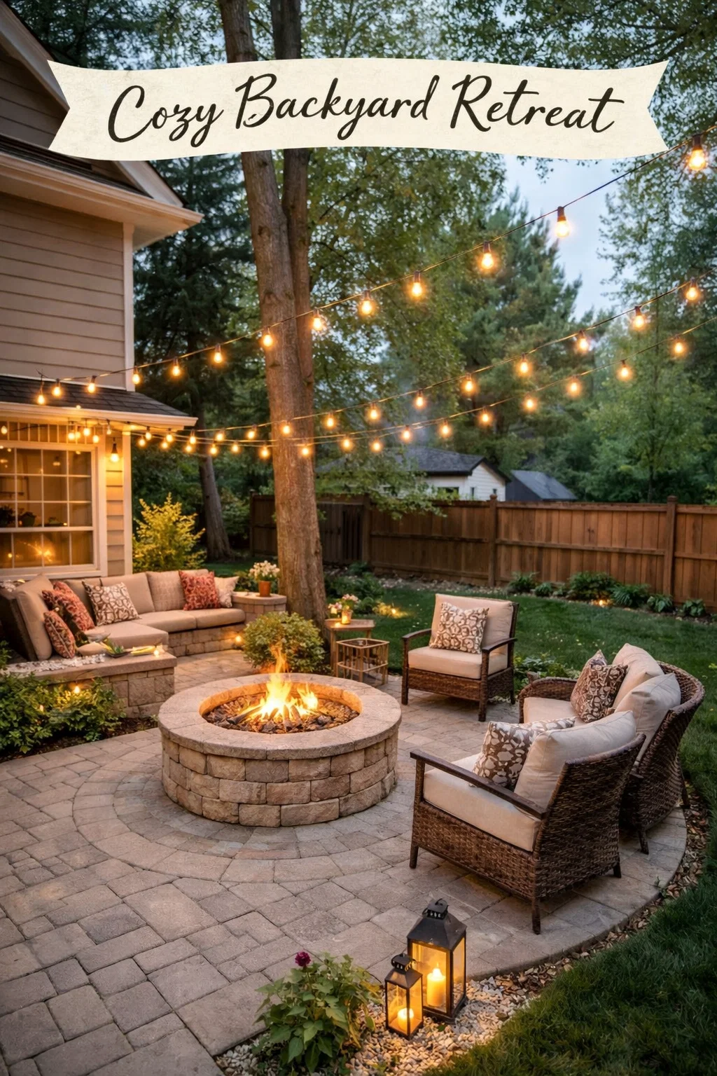 Cozy Backyard Patio Ideas with Fire Pit and String Lights for Outdoor Living