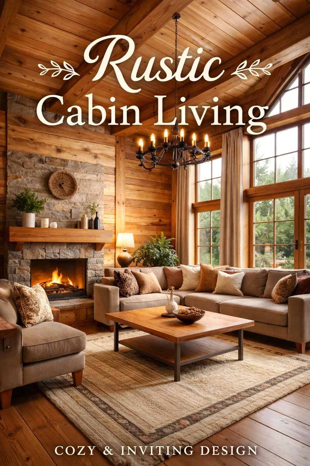 Cozy Rustic Log Cabin Living Room with Stone Fireplace and Warm Wood Decor Ideas
