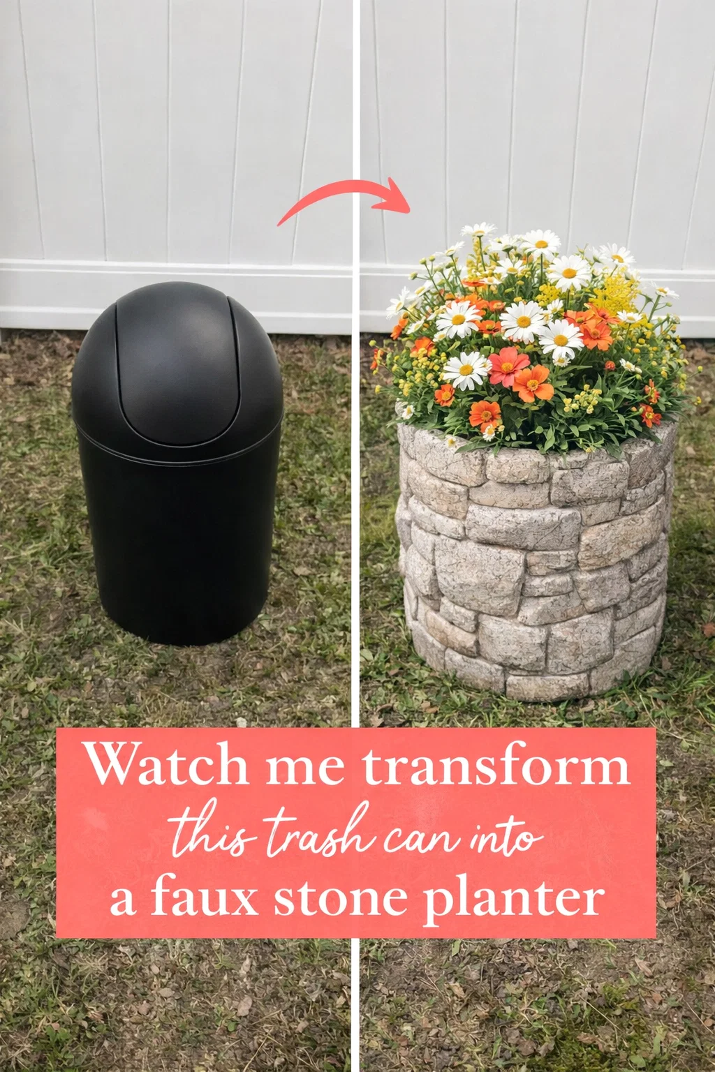 DIY Trash Can to Faux Stone Planter for Front Porch Decor