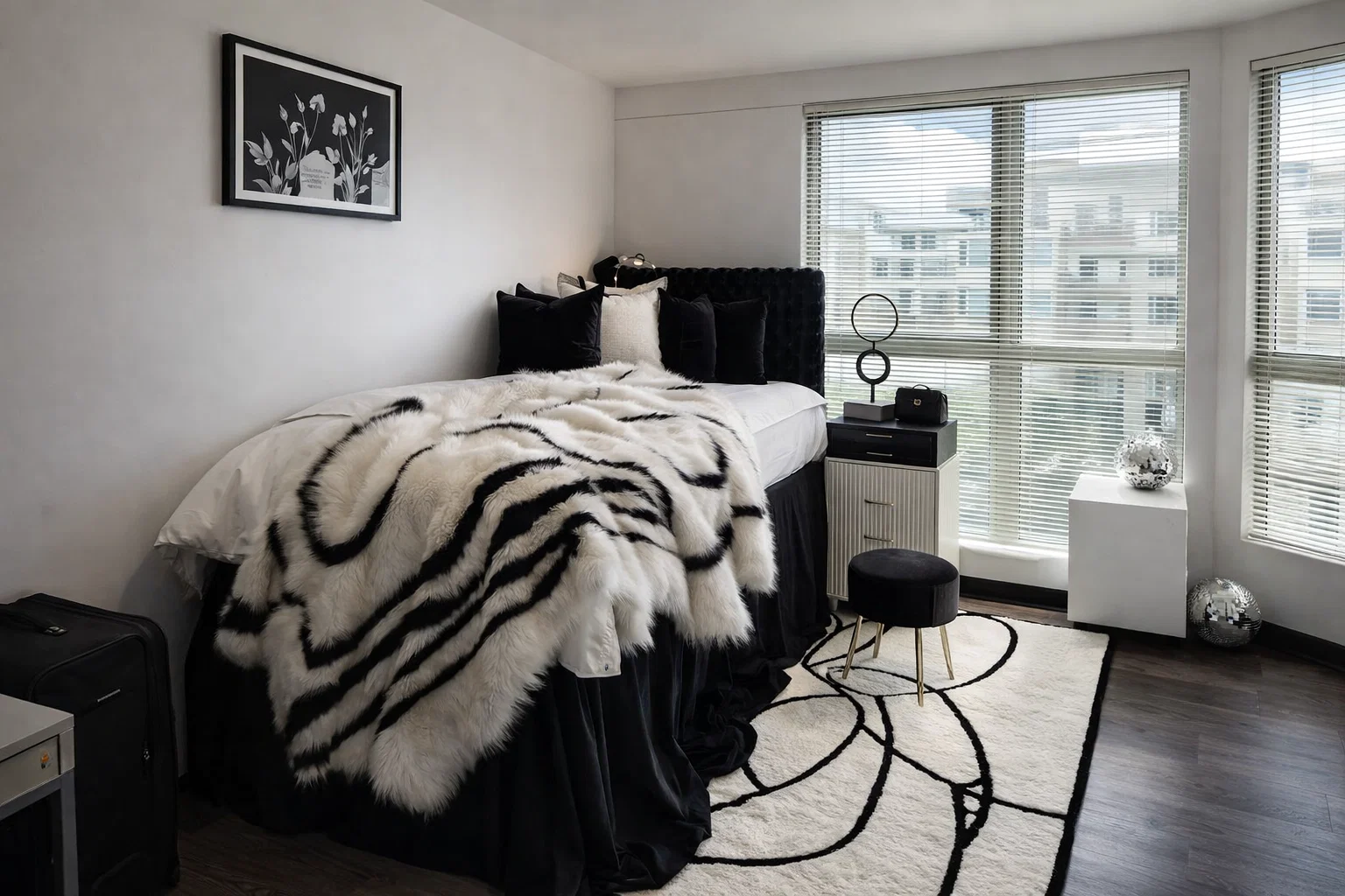 • Functional Furniture: Most dorm furniture is standard, but you can customize it. Use black contact paper to cover a dated desk or dresser. Invest in a sleek black desk lamp with adjustable lighting for tasks. A black storage ottoman or a set of stacked black crates can provide extra seating and hide clutter.