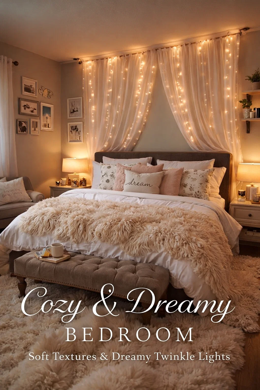 One of the most effective ways to achieve this is through the use of fairy lights or string lights. As seen in many high-end cozy designs, draping these lights behind sheer curtains or over a headboard creates a diffused, ethereal glow. The fabric acts as a natural filter, softening the individual bulbs into a continuous wash of light that feels magical rather than overwhelming. This setup provides enough illumination to move around comfortably without breaking the relaxed atmosphere you have worked so hard to create.