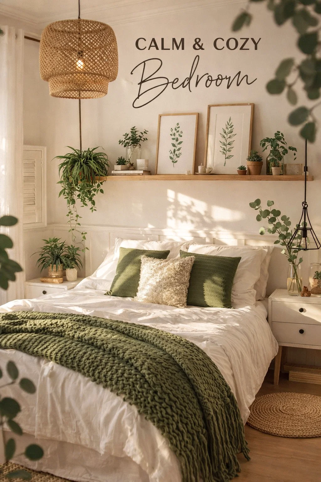 To ground the ethereal whites and greens, the room incorporates natural wood and woven materials. The wicker lampshade, the wooden shelf, and the patterned jute rug all work together to provide a sense of warmth. These materials feel tactile and “real,” which contributes to the overall comfort of the space.