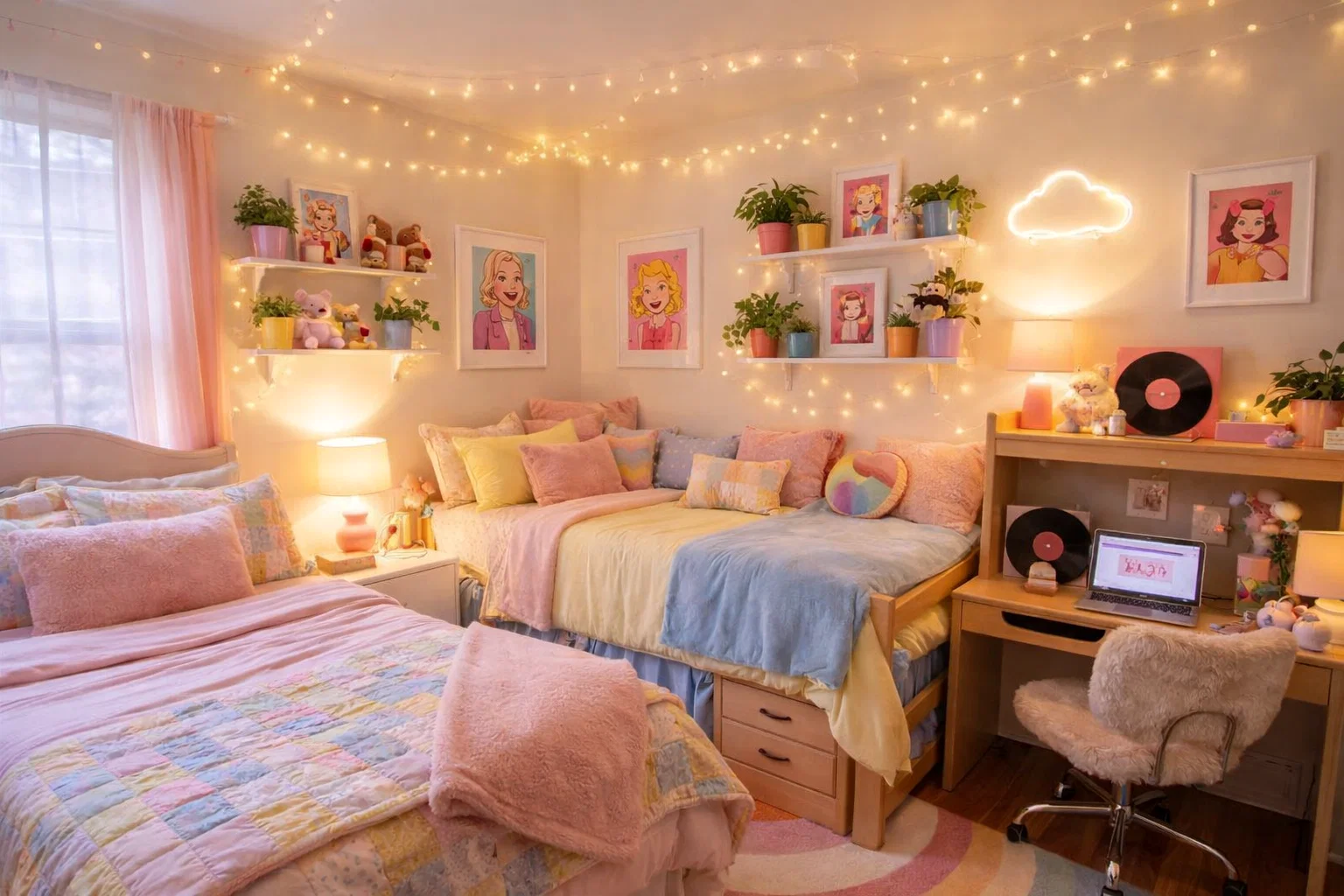 - Whimsical Lighting: Harsh overhead lights break the spell. Instead, use string fairy lights (draped over the bed frame or wall), a cute pastel table lamp, or an LED neon sign with a fun phrase for ambient, dreamy illumination.