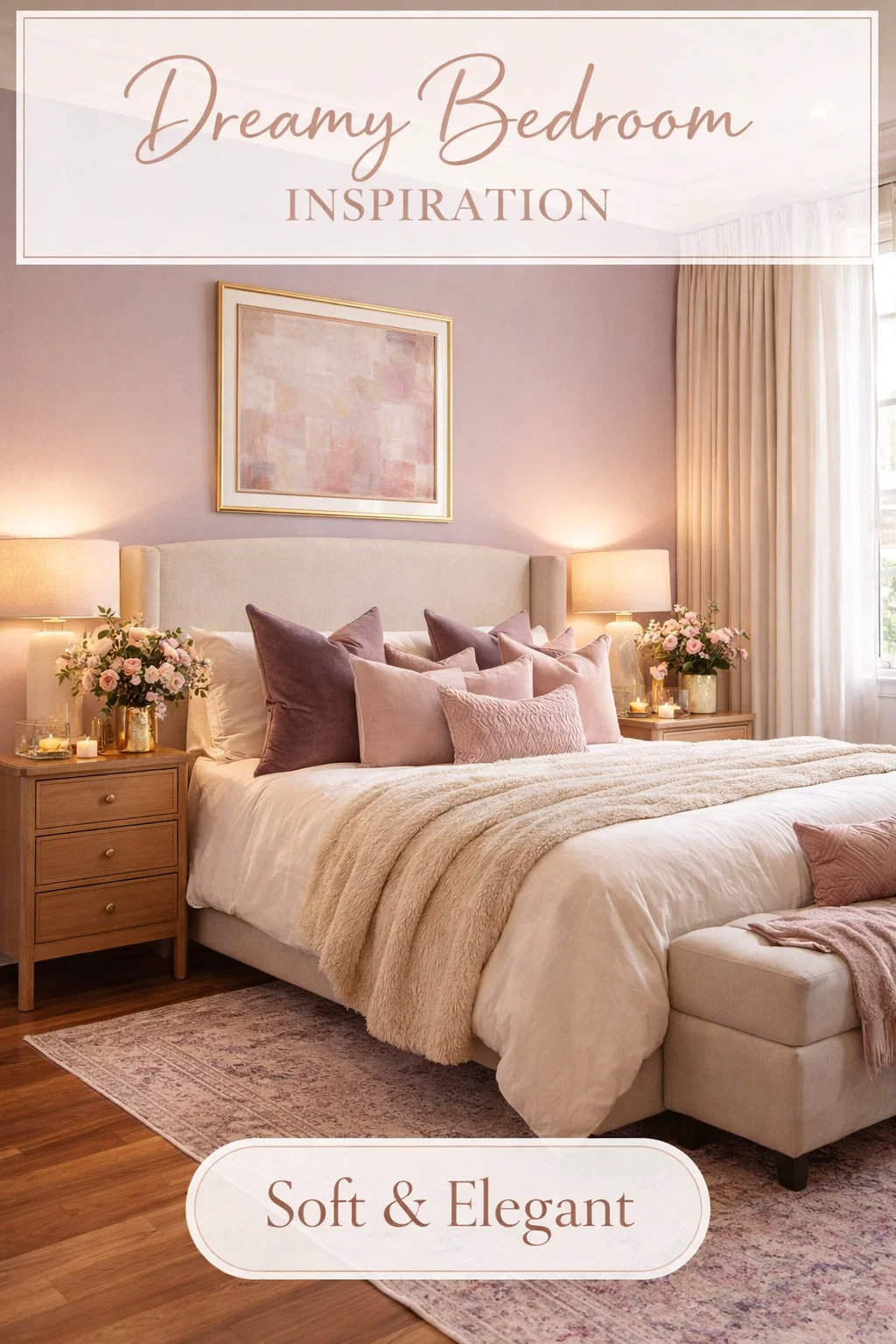 Cozy Dusty Pink Mauve Romantic Master Bedroom Decor Ideas with Gold Accents