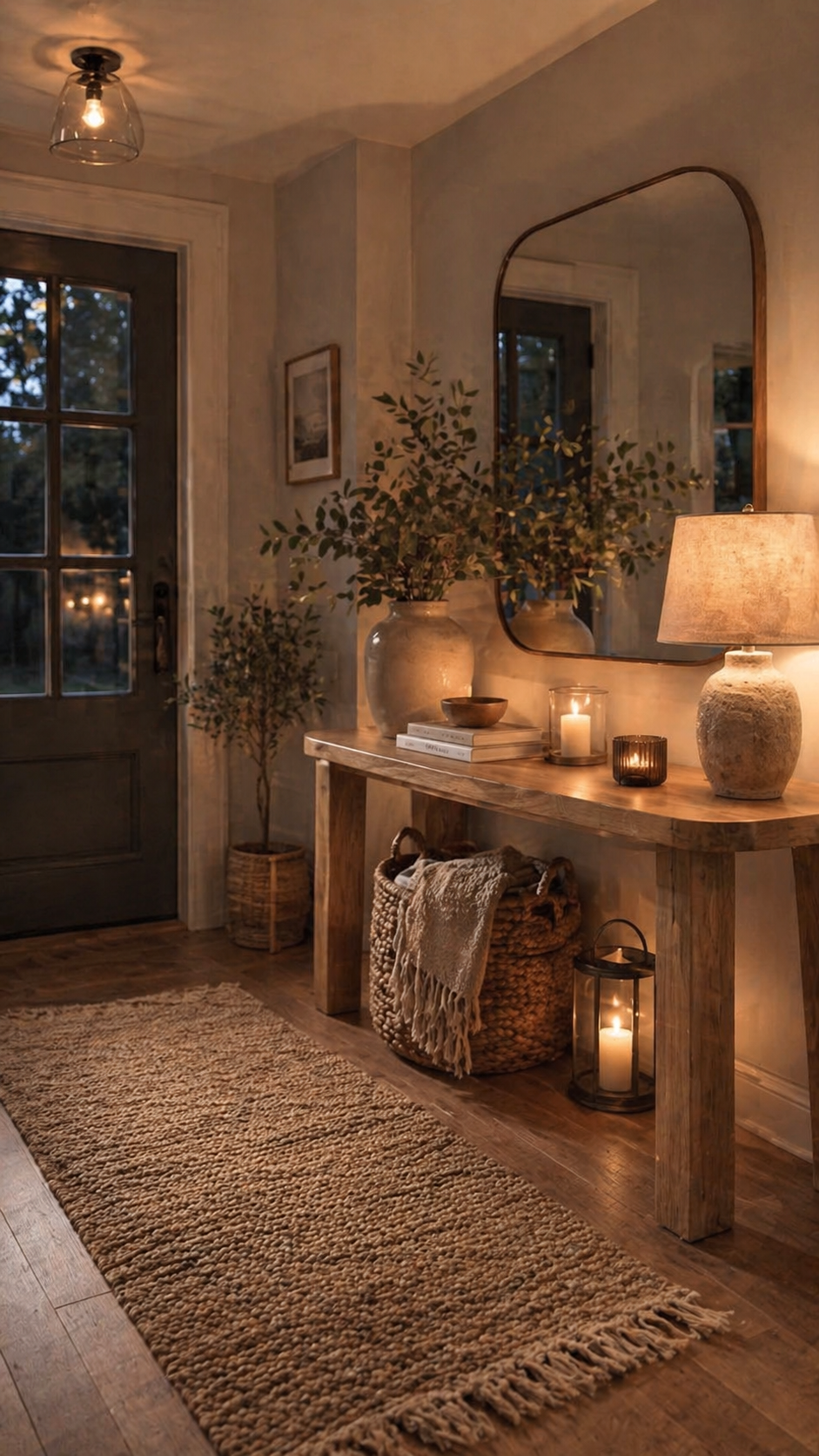 Warm-toned lighting is especially useful in an entryway because it softens shadows and makes natural textures stand out. The glow from the lamp and candles highlights the wood grain, woven baskets, and soft rug fibers. This makes the space feel layered rather than flat.