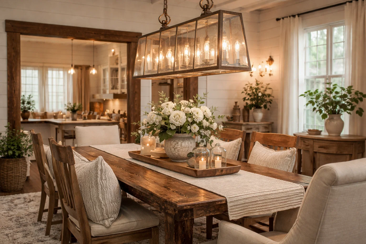 - Lighting: Lighting should be functional and sculptural. An iron or wood beam chandelier with candle-style bulbs is iconic. Complement it with wall sconces or a statement antique buffet lamp. The metal finishes should be aged iron, brushed brass, or pewter.