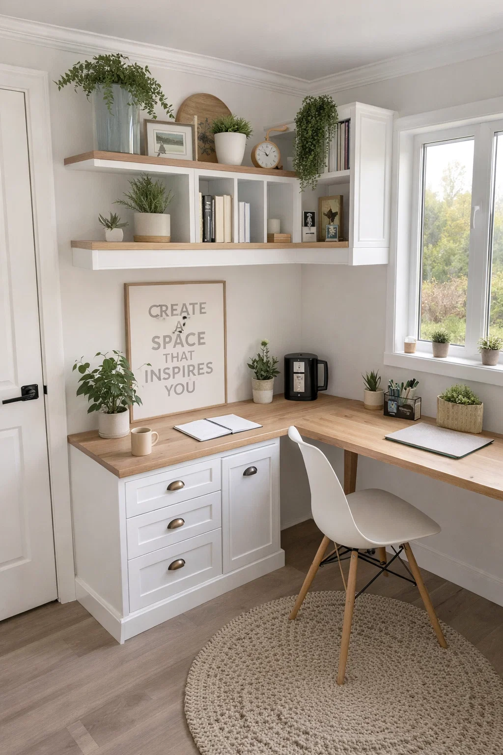 The visual appeal of a modern study nook often comes down to the contrast of materials. Pairing crisp white cabinetry with warm, natural wood countertops creates a timeless look that fits into almost any interior style. The white elements help bounce light around the room, which is crucial for smaller spaces that might not have a lot of windows. Meanwhile, the wood grain adds a layer of organic texture that prevents the space from feeling too clinical or cold. Aim for light woods like oak, pine, or birch to keep the vibe fresh and inviting.