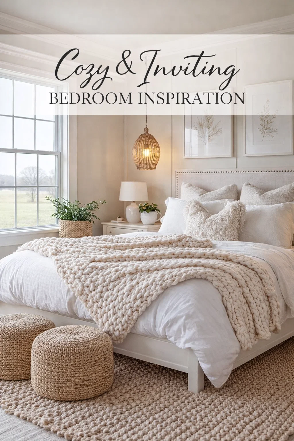 Stepping into a bedroom that feels like a warm hug is one of life’s simplest yet most profound pleasures. The image before us captures the essence of what it means to create a sanctuary that balances minimalist aesthetics with maximum comfort. This space is a masterclass in organic modern design, showcasing how a monochromatic white and cream palette can feel incredibly rich and layered through the strategic use of texture. From the oversized chunky knit blanket to the subtle glow of a woven pendant light, every element works in harmony to invite relaxation and peace.