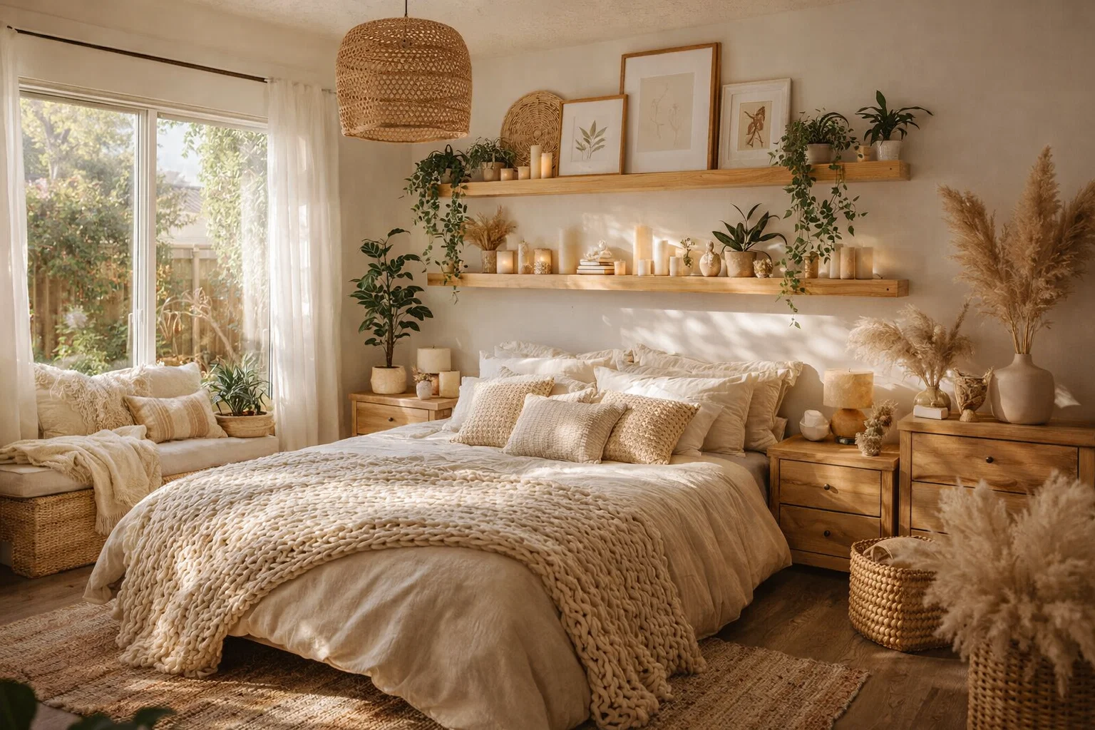 • Natural & Ambient Lighting: Avoid harsh overhead lights. Instead, use a combination of sources: a woven pendant or a simple paper lantern for ambient light, table lamps with ceramic or rattan bases on nightstands, and several clusters of candles (in safe holders) for a warm, flickering glow.