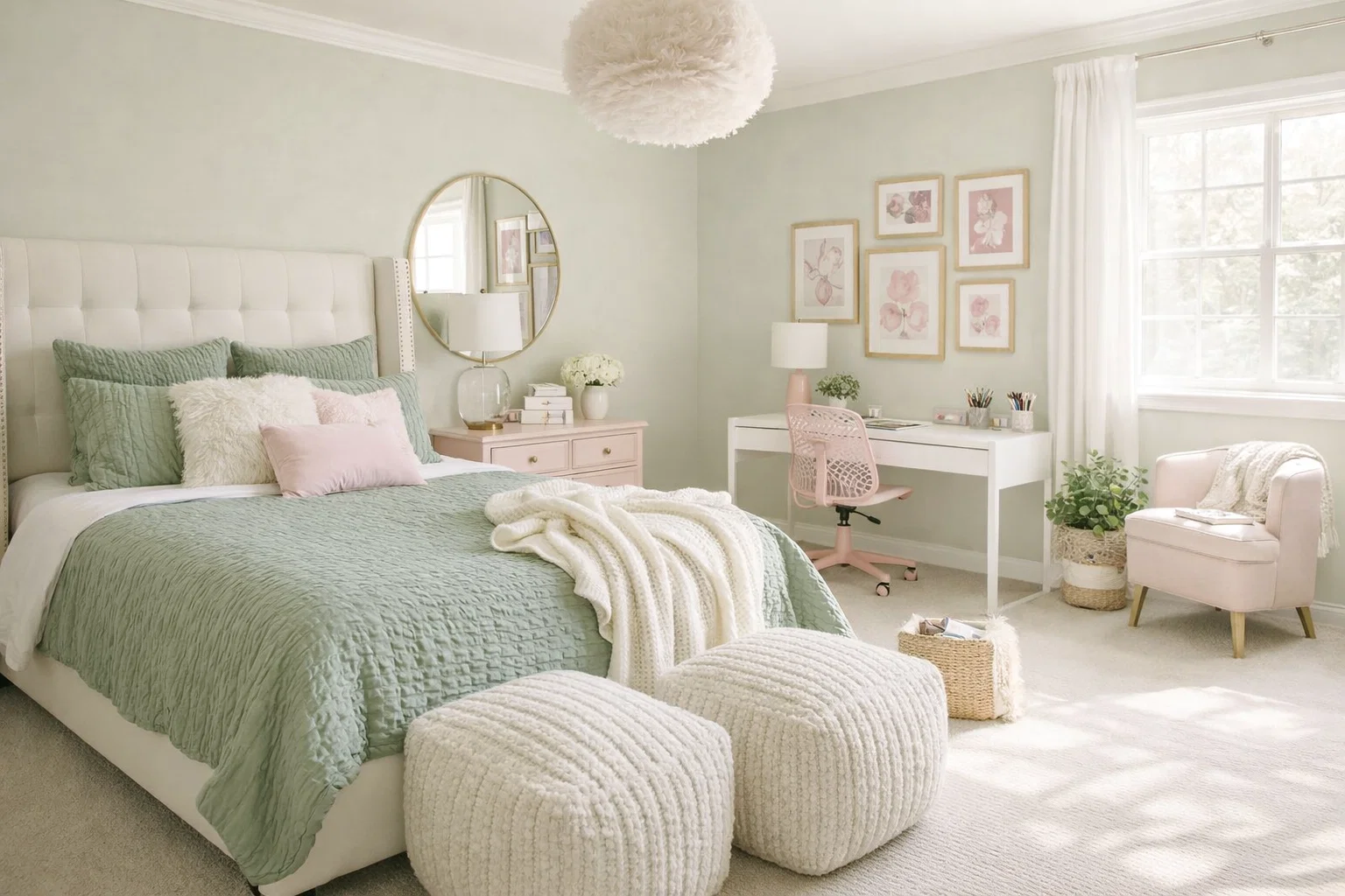 Cozy Pastel Dorm Room Ideas: Embrace Sage Green and Soft Pink Accents for an Earthy Vibe