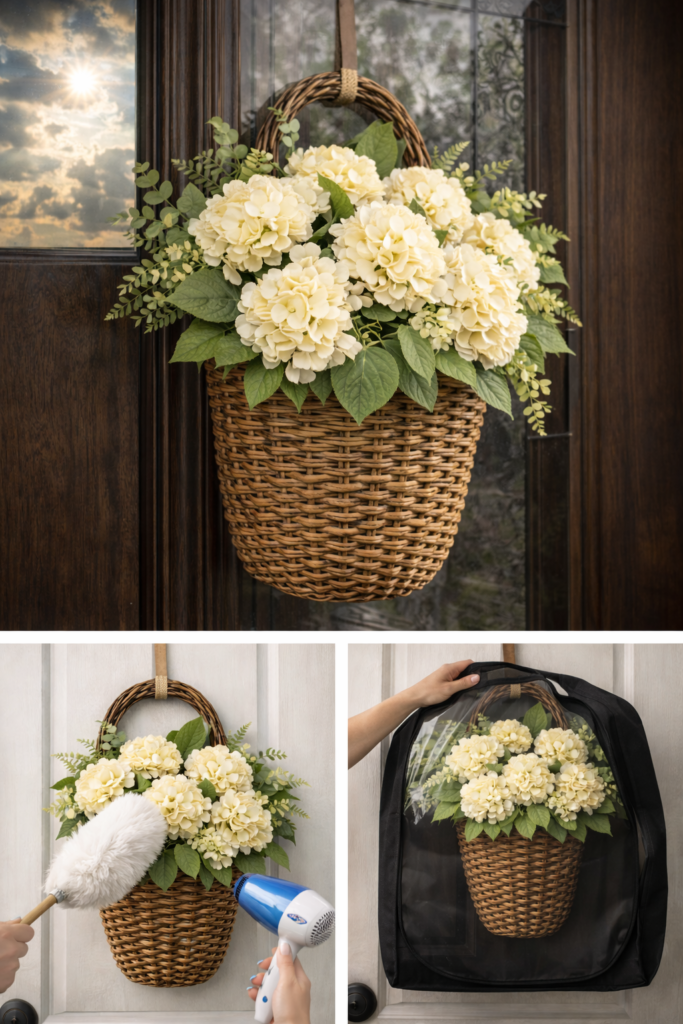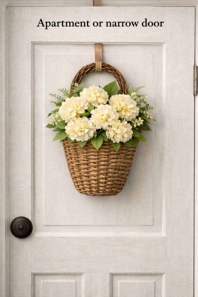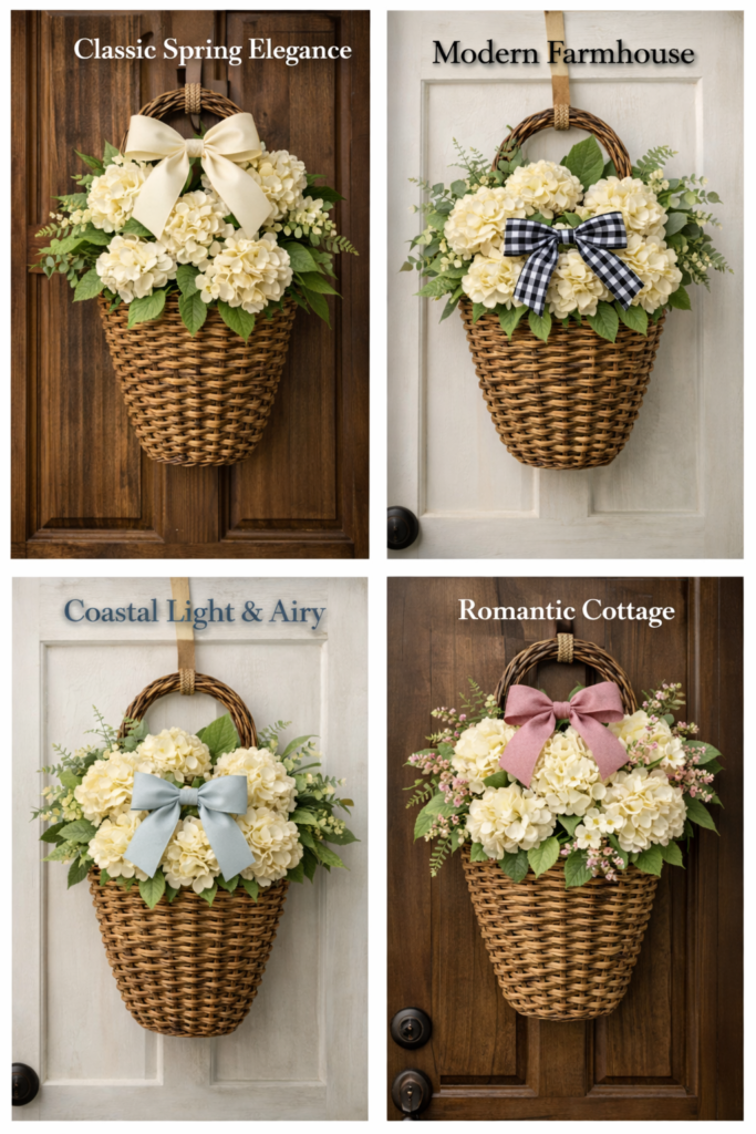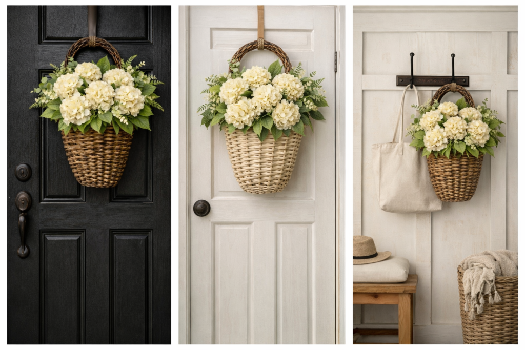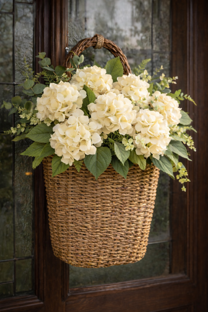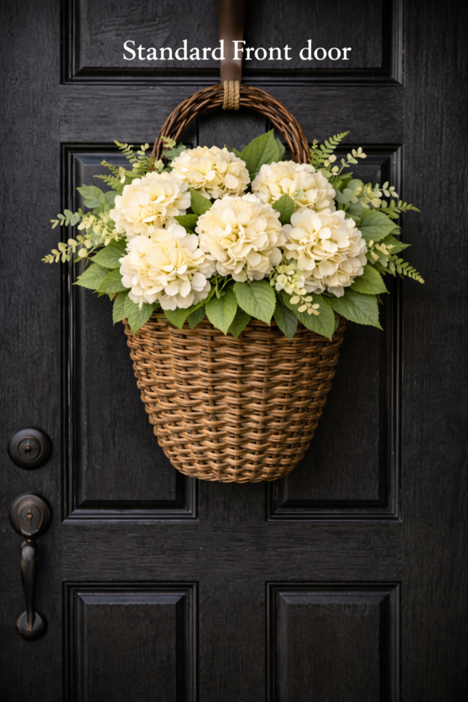 If you just clicked in from Pinterest, chances are you paused on that photo—the soft cream hydrangeas, the basket shape, the “fresh but classy” spring vibe. And now you’re thinking: Would this look good on my door? (Or: I need this for my entryway immediately.)