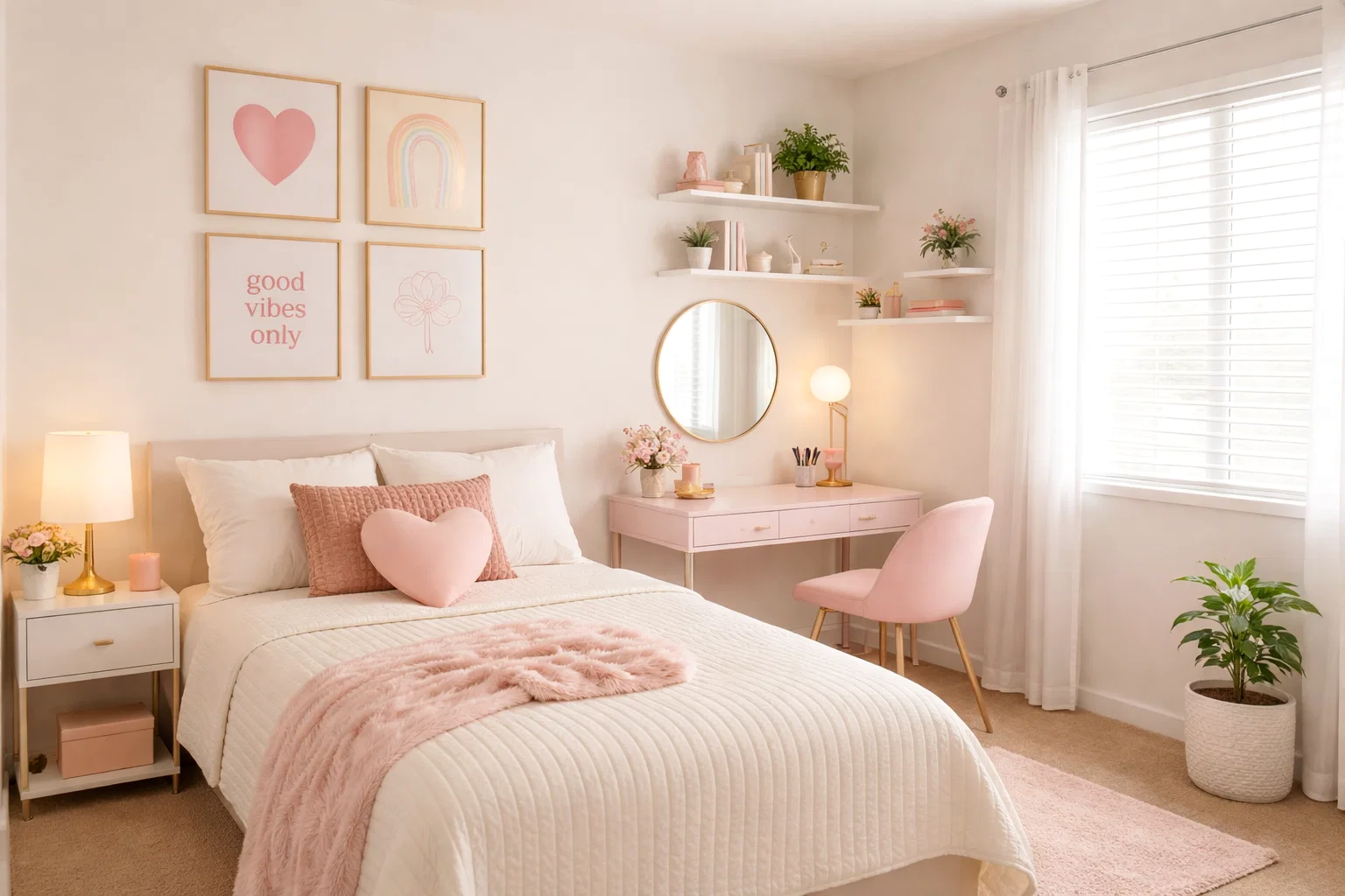 Immediately add ambient lighting. Drape fairy lights over your headboard or along the wall. Place a small table lamp with a pink or neutral shade on your desk or a shelf. This step instantly kills the institutional feel and adds coziness.