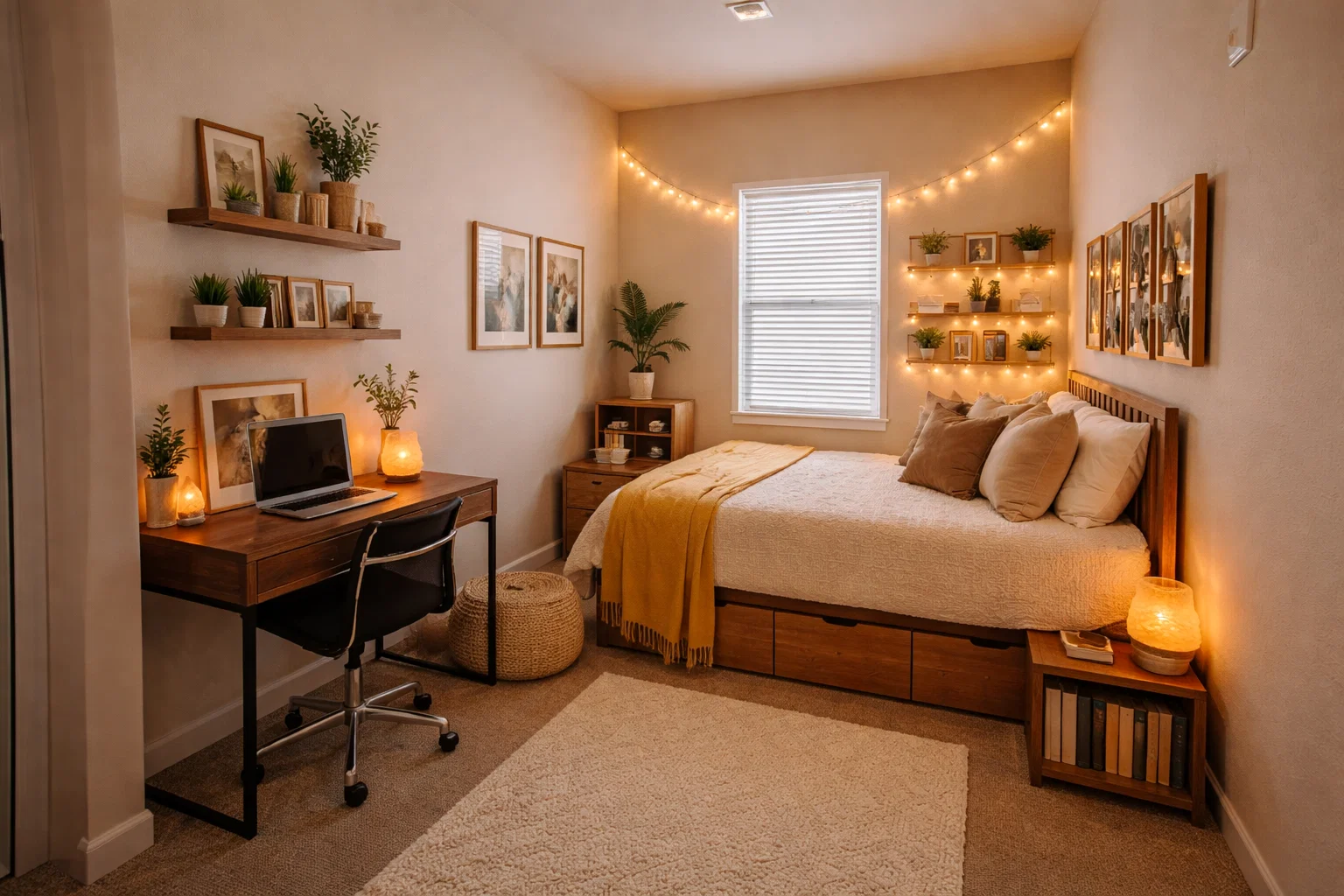 Install bed risers to unlock under-bed storage. Invest in uniform, stackable bins to keep items organized and out of sight. Next, add vertical storage: install floating shelves above the bed head for books and decor, or use an over-the-door organizer on the closet for shoes and supplies.