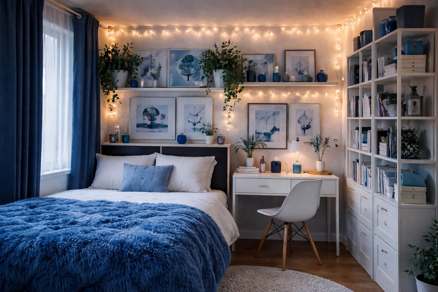 Finally, decorative accents personalize your space. Wall art featuring blue hues, a few green plants in white ceramic pots (snake plants or pothos are dorm-friendly), and decorative storage baskets in natural fibers complete the look. String lights with white cords add a magical, dreamy glow in the evenings.