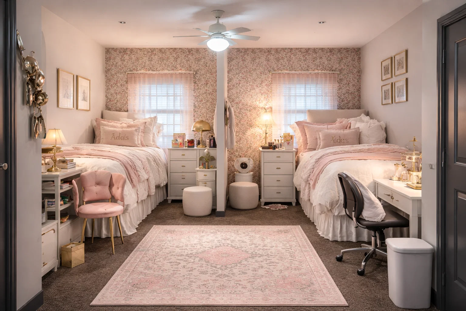 A: Communication is key! Find a simple, neutral common ground for shared elements like an area rug or a color scheme. Then, personalize your own bed and wall area to your heart’s content. Matching bedding in complementary colors can look cohesive without being identical.