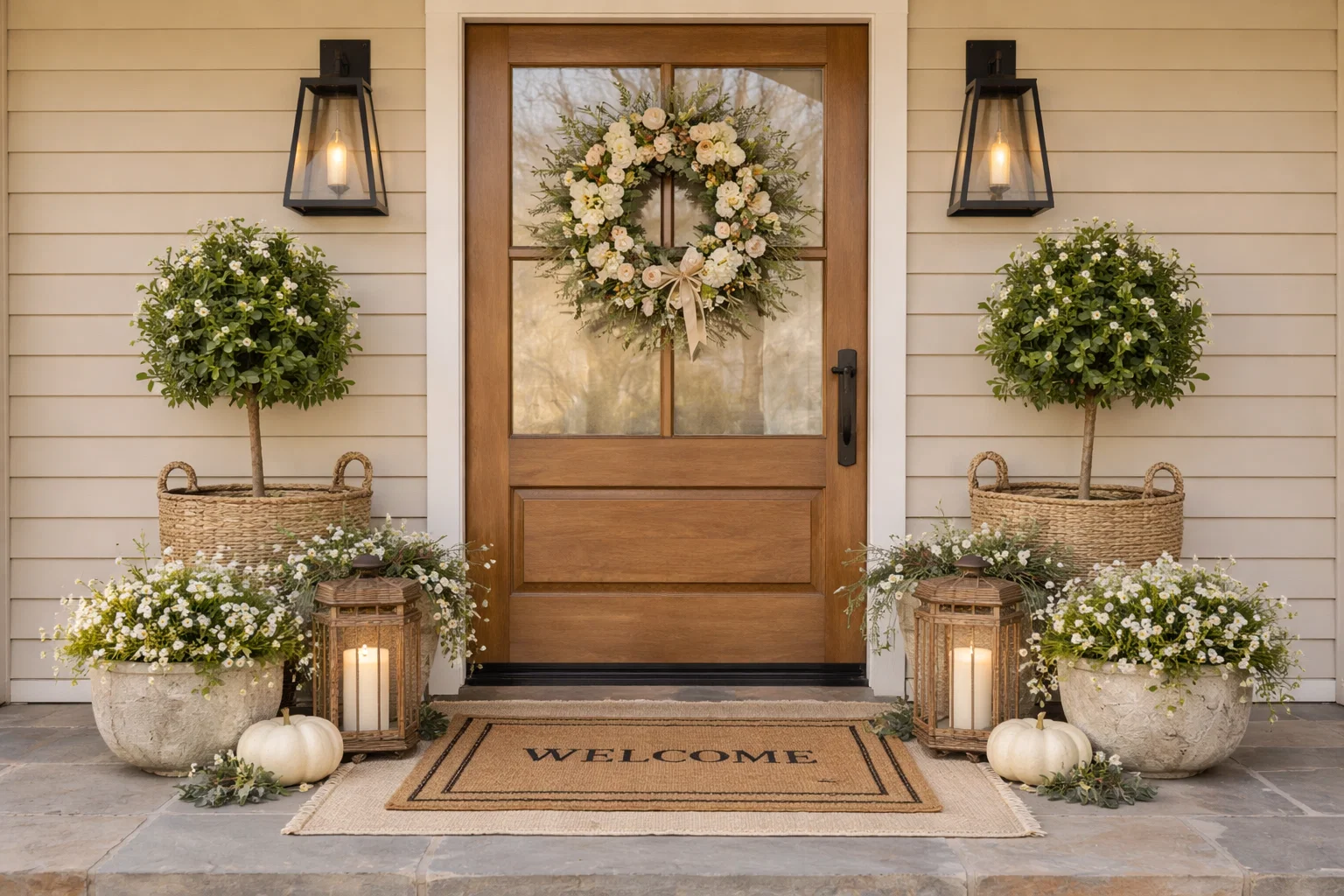 This final step brings your front porch decor to life. Hang a wreath on the door, place a witty or welcoming doormat, and add a few personal accessories like a wind chime, a small tray for corralling items on a table, or a piece of outdoor-safe art. Step back and edit—sometimes less is more.