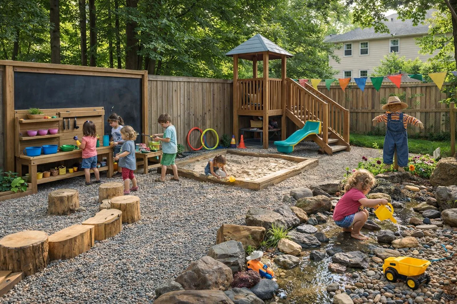 This is where the fun truly takes shape. Set up your mud kitchen with old pots and pans. Create a water play station against a fence. Arrange tree stump steppers for a balancing course. Plant a small, sturdy sensory garden with herbs like mint and lavender, and sturdy plants like lamb’s ear for touching. These elements transform a simple gravel yard into an immersive exploration backyard.