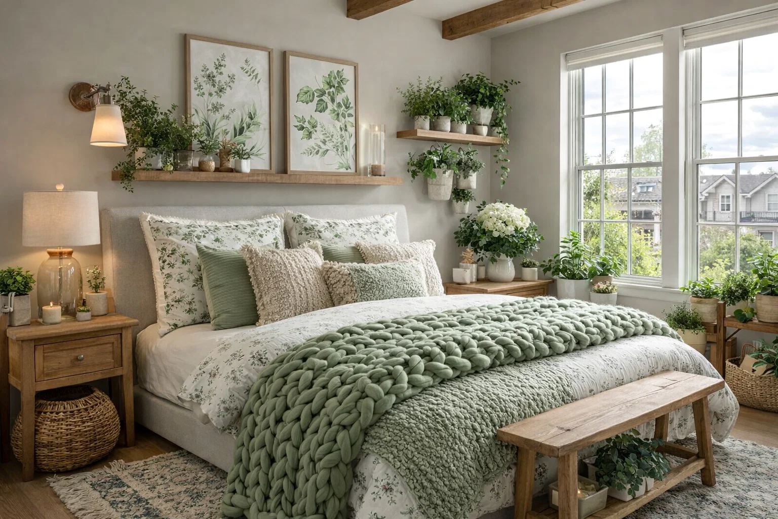 Start with your base layer (sheets), then add a blanket or coverlet, followed by a duvet or comforter. Introduce your green and gray colors here through pillows and throws. Mix textures: linen sheets, a cable-knit throw, and velvet pillows. Add a plush rug beside the bed for underfoot comfort. These layers are key to making the space feel inviting and designed.