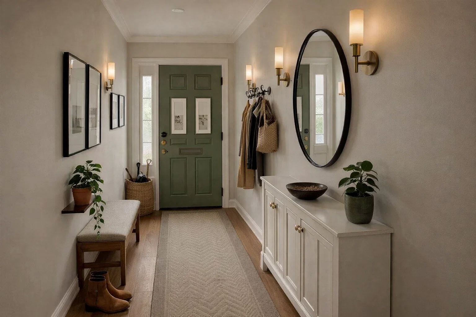 Add artwork if wall space allows, either beside the mirror or in a small gallery arrangement. Introduce life with a low-maintenance plant like a ZZ plant or a snake plant. Finally, consider scent with a subtle diffuser or candle. These final layers add depth, warmth, and a finished feel to your home entrance design.