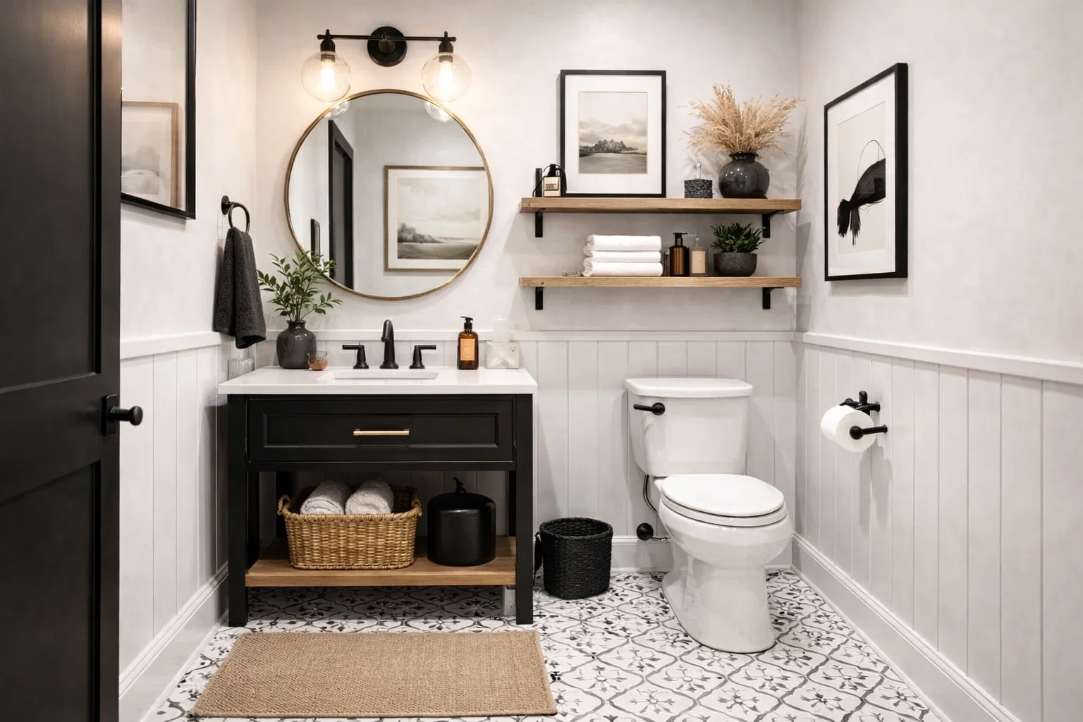 Start with the permanent or semi-permanent features. Choose your wall color (often a crisp white or warm white) and your tile selection for floors and wet areas. Remember, pattern here (like a black hex floor) adds major impact. If you’re using patterned tile, keep other surfaces simple to avoid visual chaos.