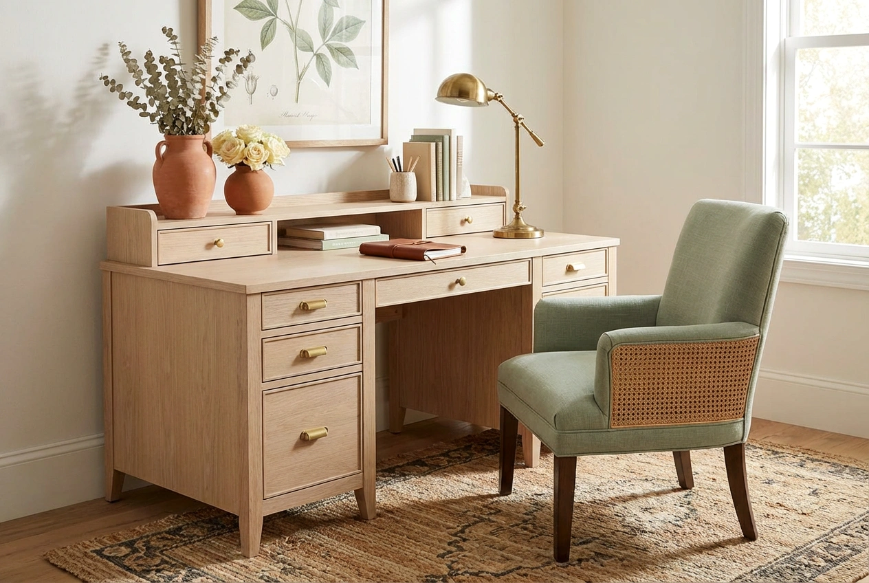 * Scandinavian: Focus on light, airy woods (like ash or birch) and clean shapes. A white or light wood writing desk paired with a chair featuring gentle curves and a light fabric upholstery is perfect. Add cozy texture with a sheepskin throw over the chair.
